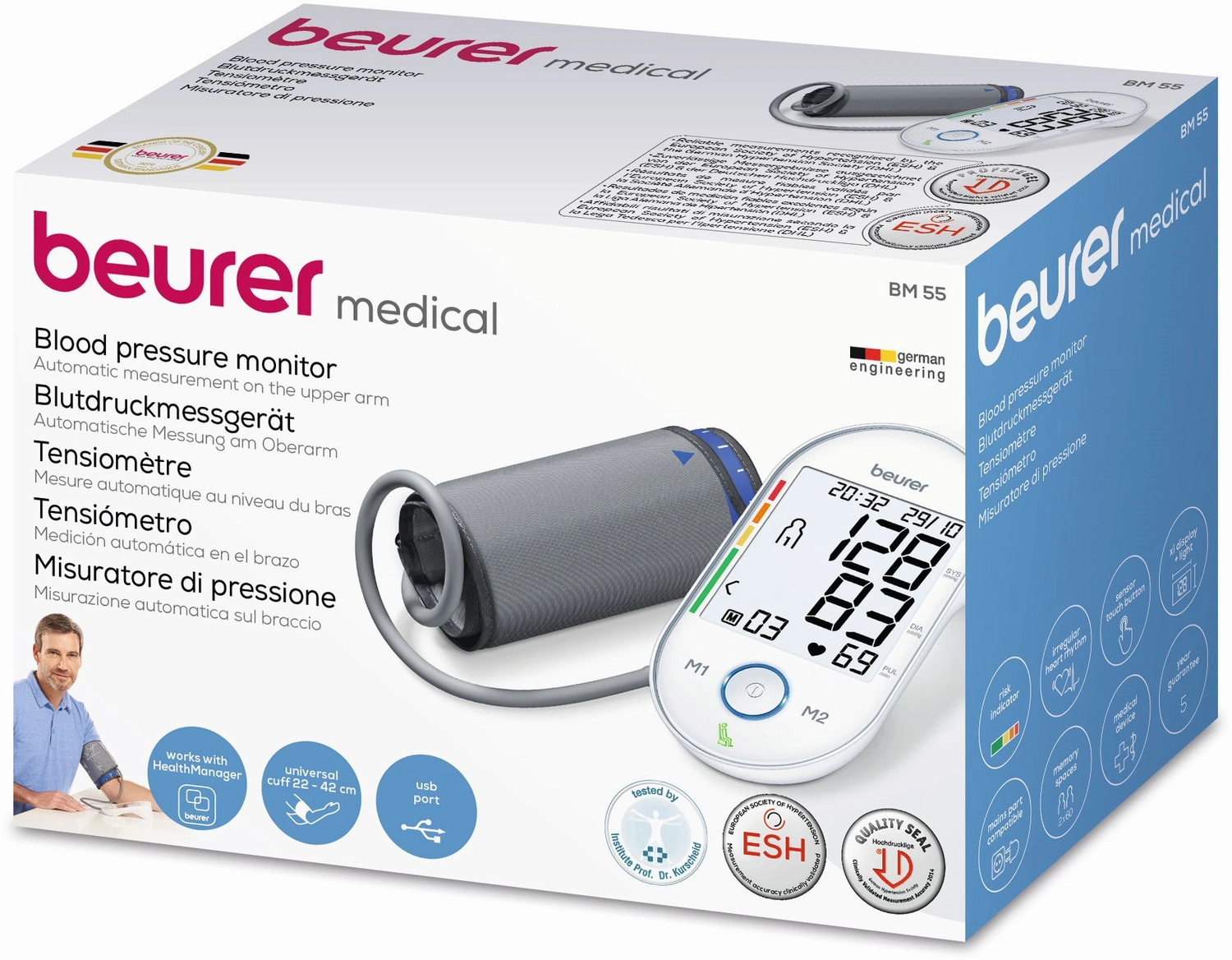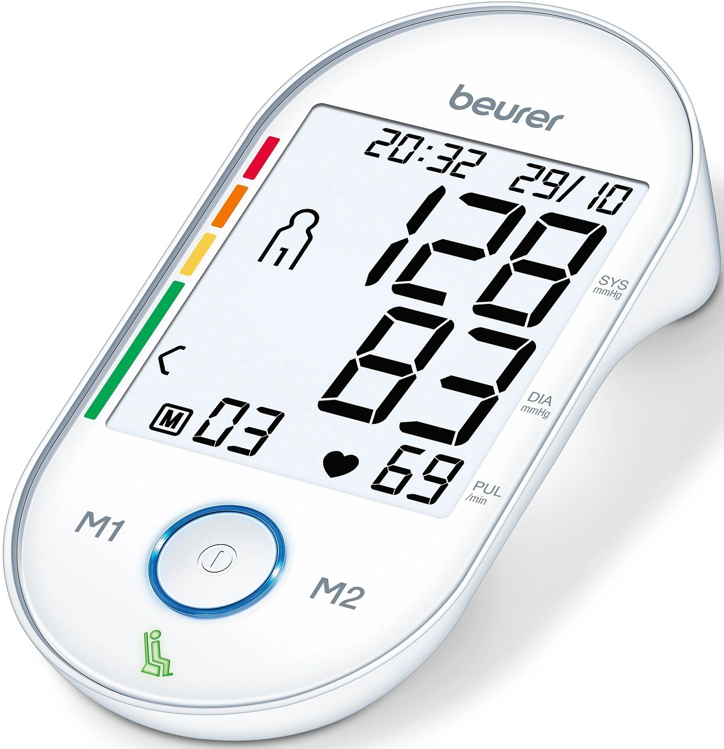 Исключительно точный, высококачественный и безопасный прибор для измерения кровяного давления в плечевой артерии с запатентованным индикатором положения стабилизации, большим дисплеем с белой подсветкой и сенсорными кнопками.