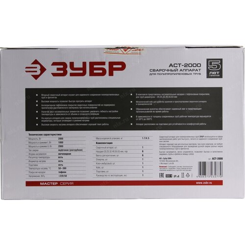 ЗУБР Мастер [АСТ-2000] Сварочный аппарат (паяльник) для полипропиленовых труб ( АСТ-2000, 1000/2000Вт, 50-300С, насадки 20, 25, 32, 40, 50, 63мм, мет. кейс, 220В )