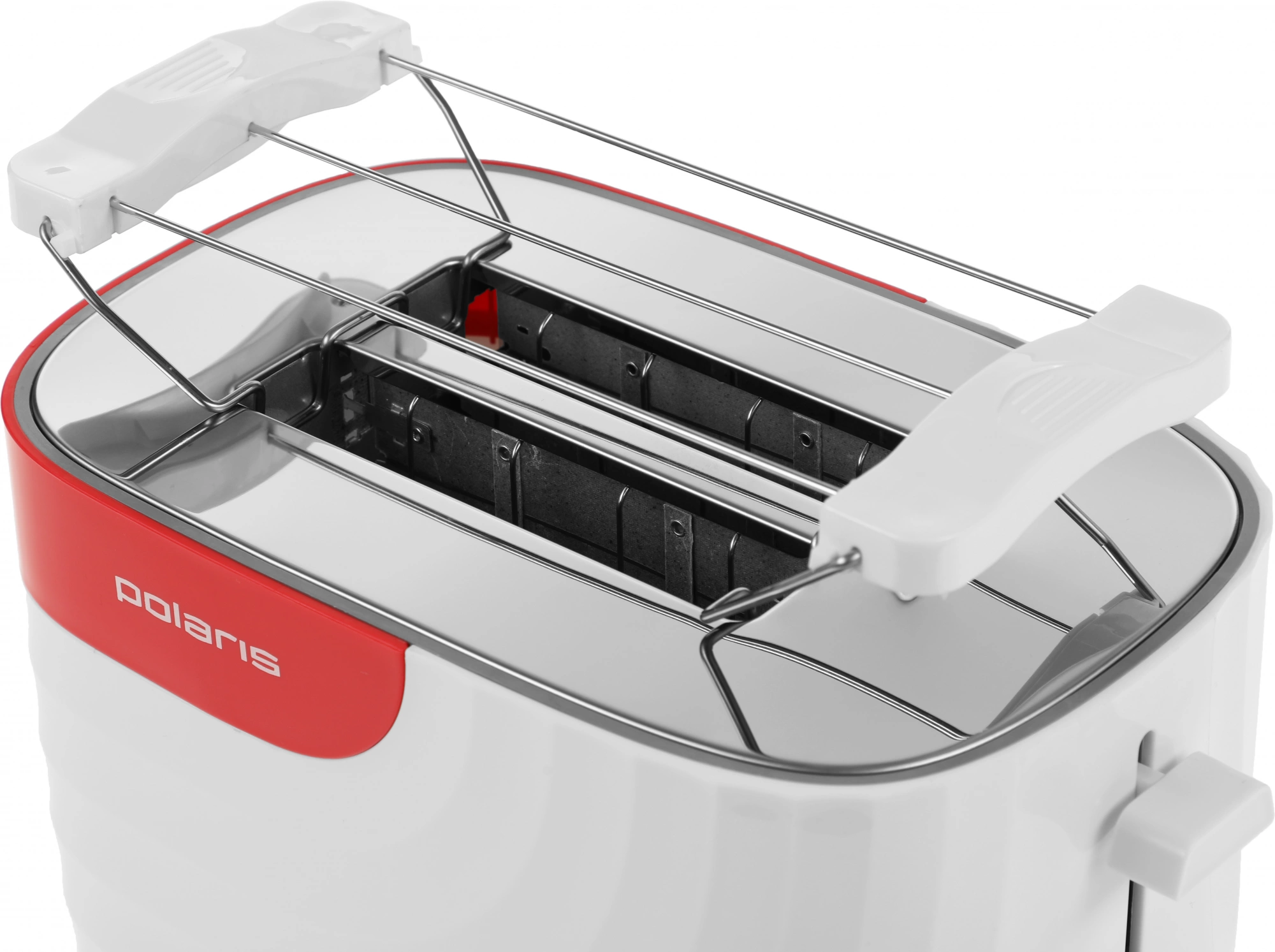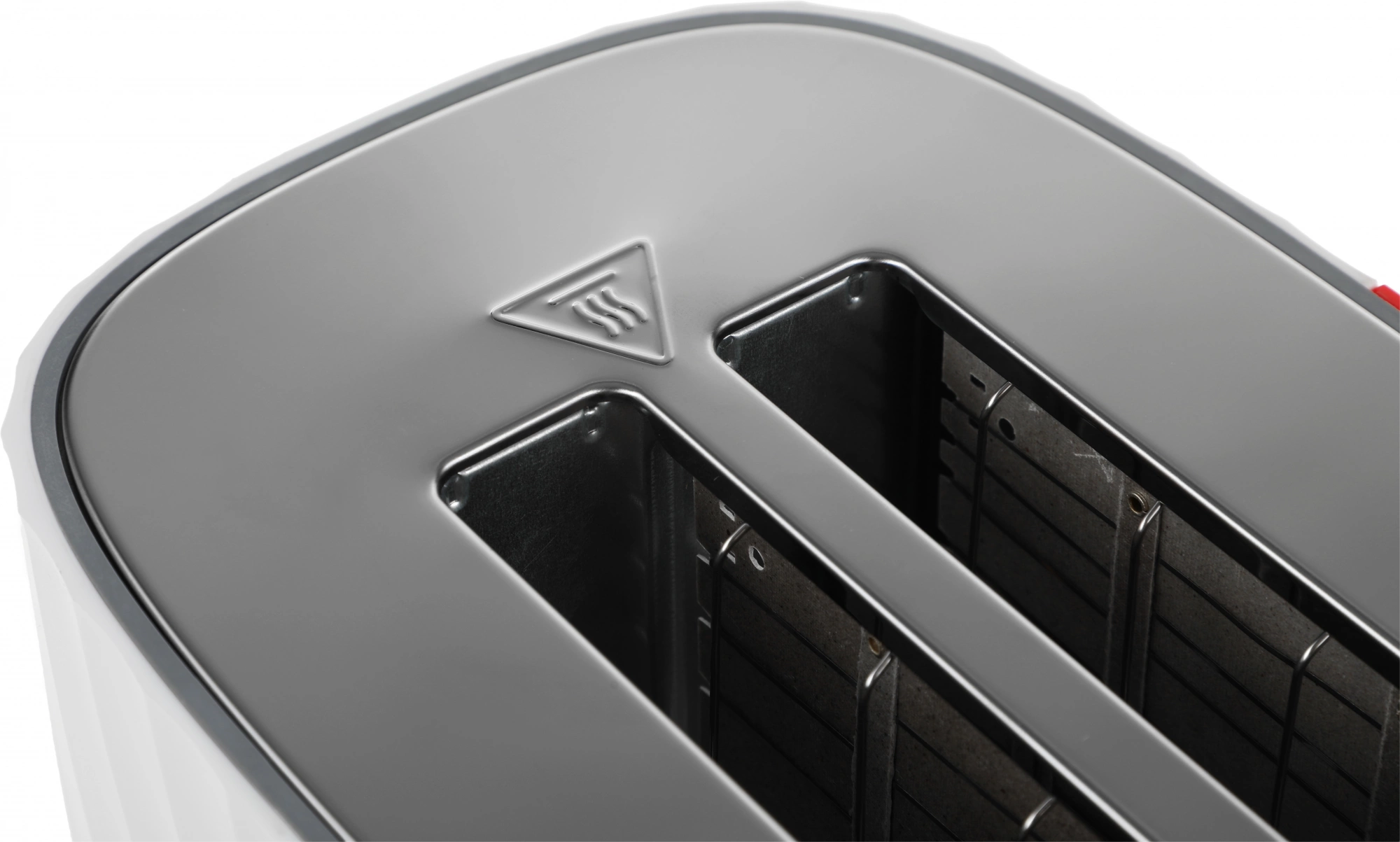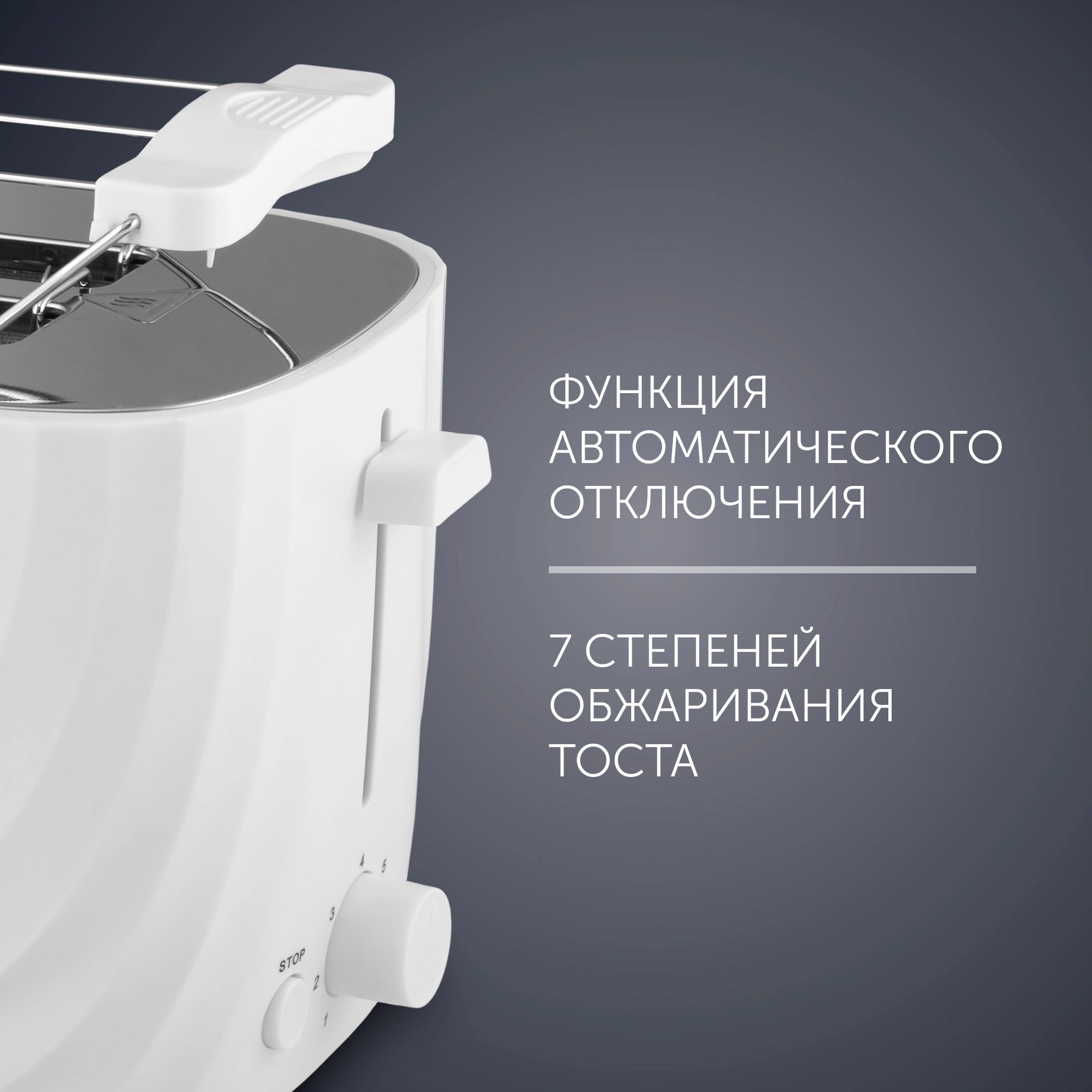 Корпус из термостойкого пищевого пластика. 7 степеней обжаривания тоста. 2 отсека для тостов. Решетка для подогрева булочек. Отсек для наматывания шнура. Кнопка отмены. Поддон для крошек. Функция автоматического отключения.