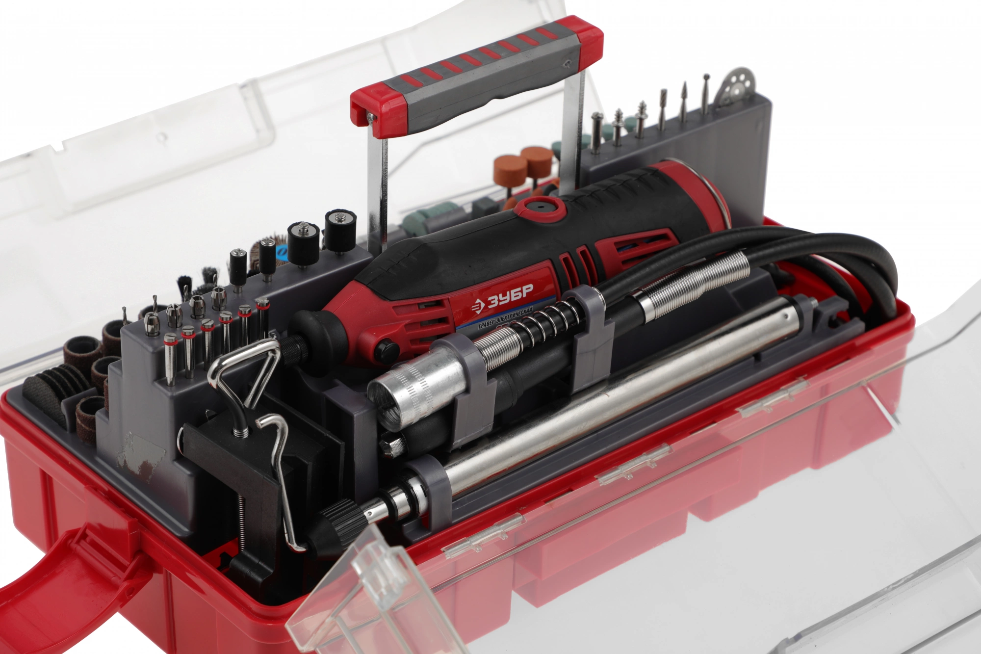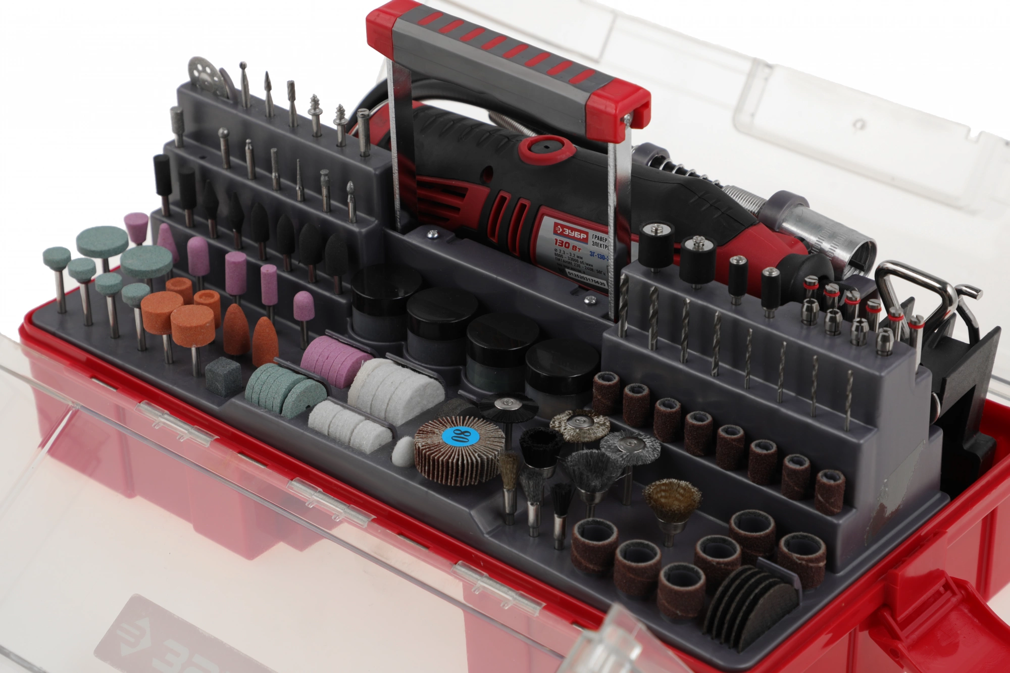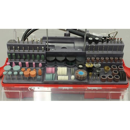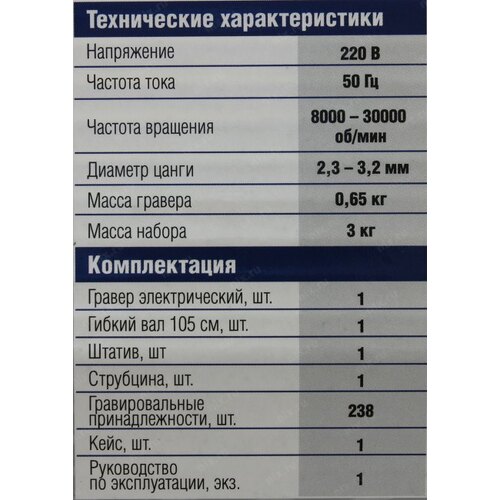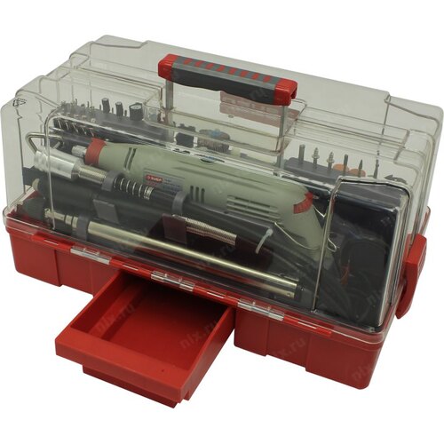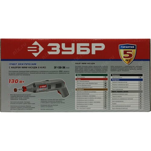 Гравер, или, как их еще называют, дремель (Dremel) ЗУБР - это надежный инструмент с мощным двигателем, способный выполнить широкий круг задач (резка, полировка, гравирование, шлифование). Помимо набора насадок, данная модель имеет в комплекте гибкий вал, штатив, кронштейн для штатива. Набор мини-насадок позволяет в домашних условиях осуществлять тонкую чистовую высокоточную обработку различных материалов без применения дорогостоящего профессионального оборудования. Применяется для полировальных, шлифовальных, заточных и отрезных работ по дереву, металлу, пластику и многим другим материалам.;;В комплекте богатый набор насадок и приспособлений (238 предметов)