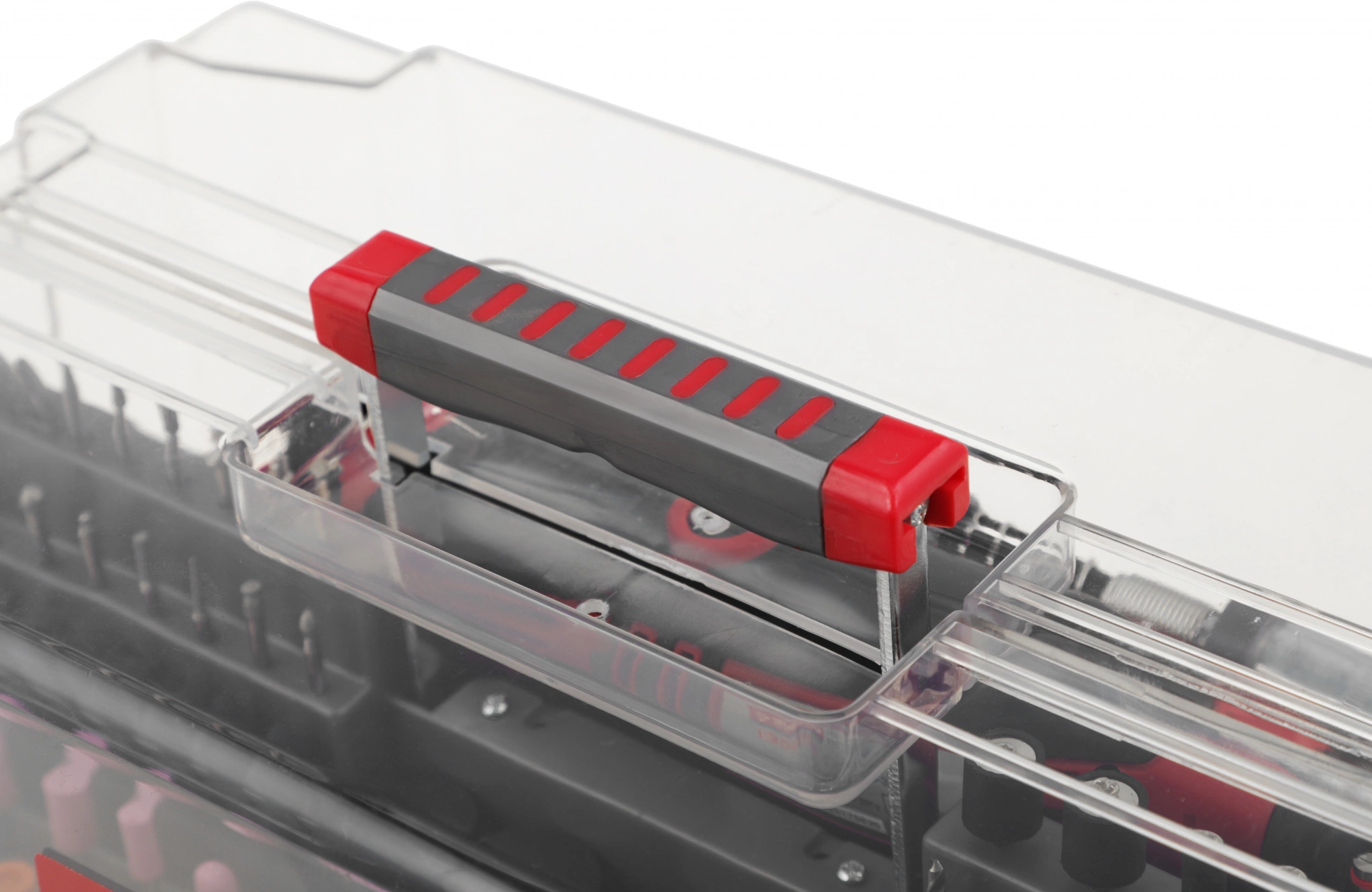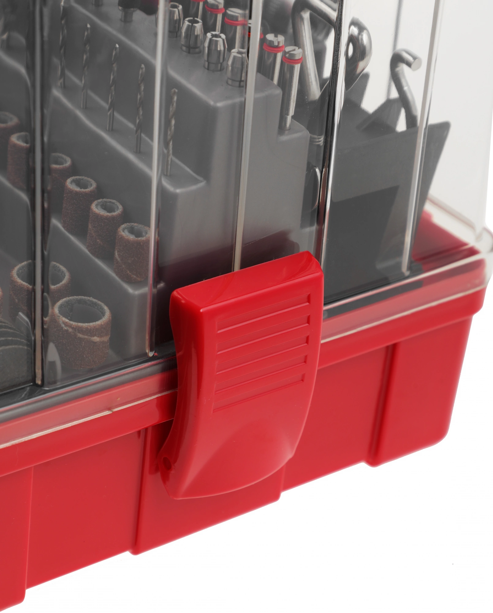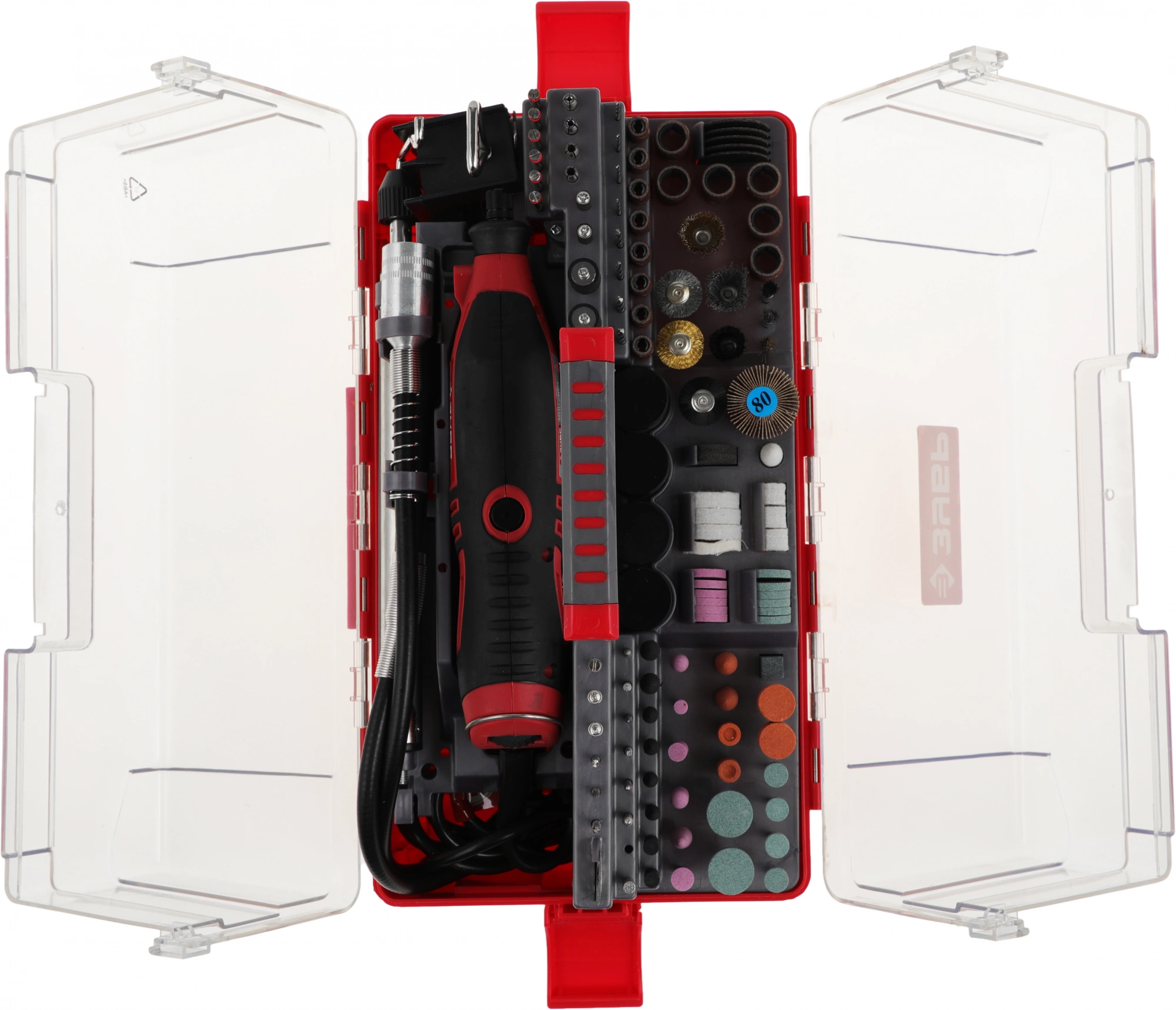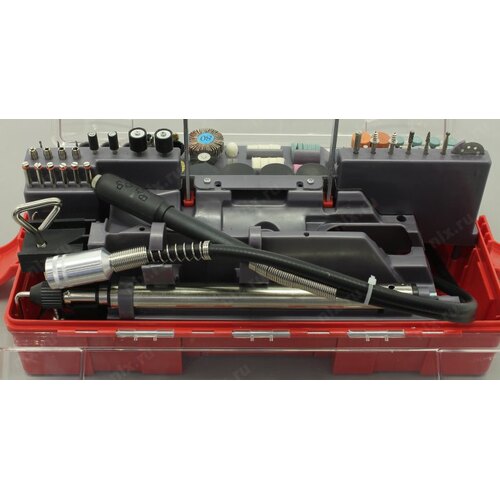 Коробка для оснастки, Набор шлифовальной и отрезной оснастки, Чемодан.;;Оснастка включает в себя: цанги, гибкий вал, штатив, кронштейн штатива, круги шлифовальные, войлочный полировальный круг, фетровые полировальные круги, державка для фетровых кругов, резиновые полировальные круги,;;сверла по металлу, державки для шлифовальных цилиндров, шарошки с алмазным напылением, шарошки металлические, круг отрезной с алмазным напылением, шарошки резиновые шлифовальные с хвостовиком,;;абразивные шлифовальные круги по металлу/камню с хвостовиком, абразивные шлифовальные круги по металлу/камню, щетки-крацовки, шлифовальные круги, усиленные отрезные абразивные круги, отрезные абразивные круги, ;;отрезные армированные круги, оправки, ключ гаечный, брусок абразивный правочный.
