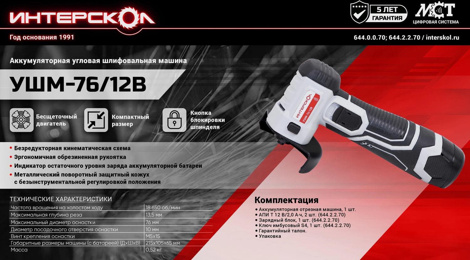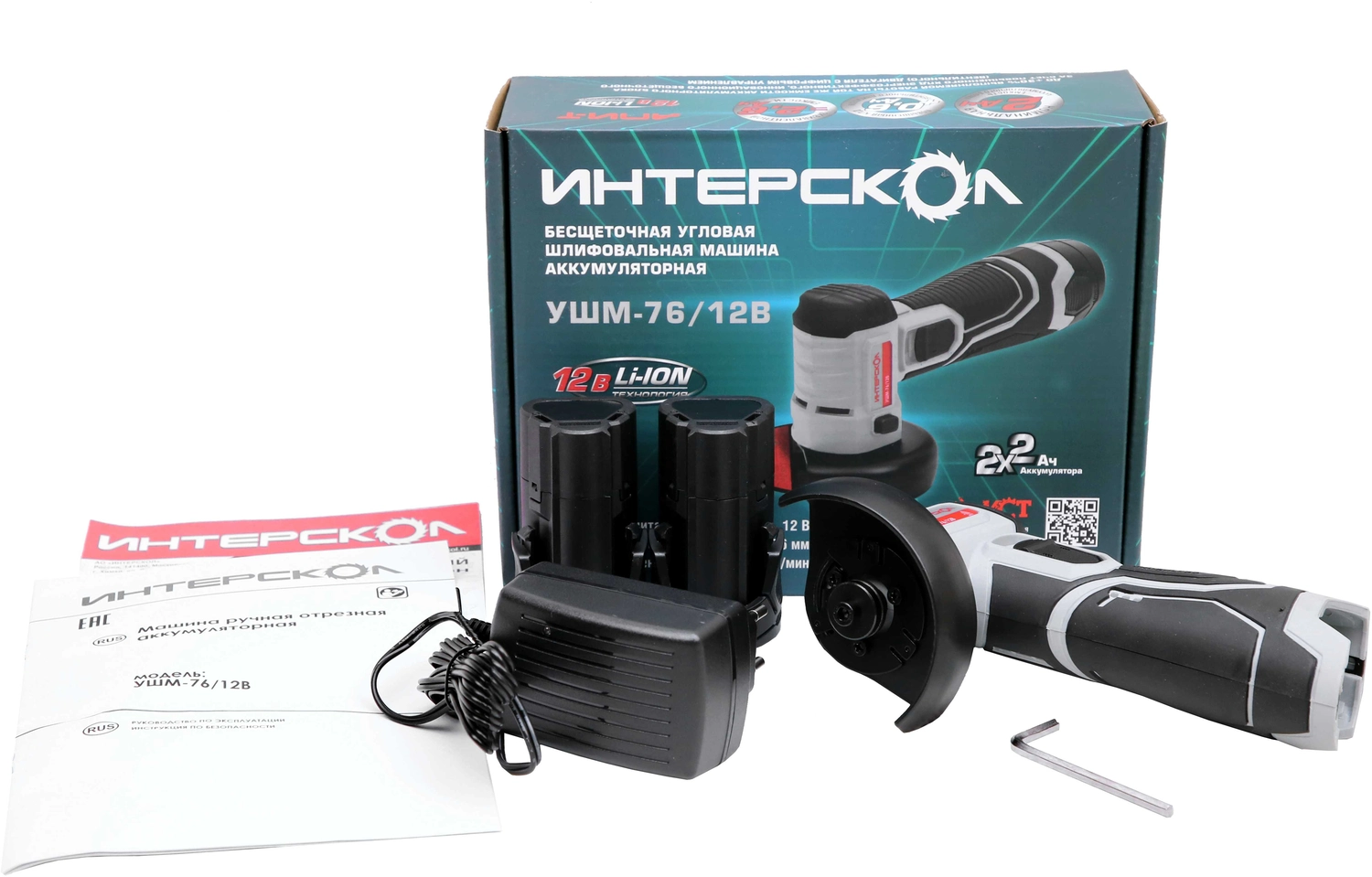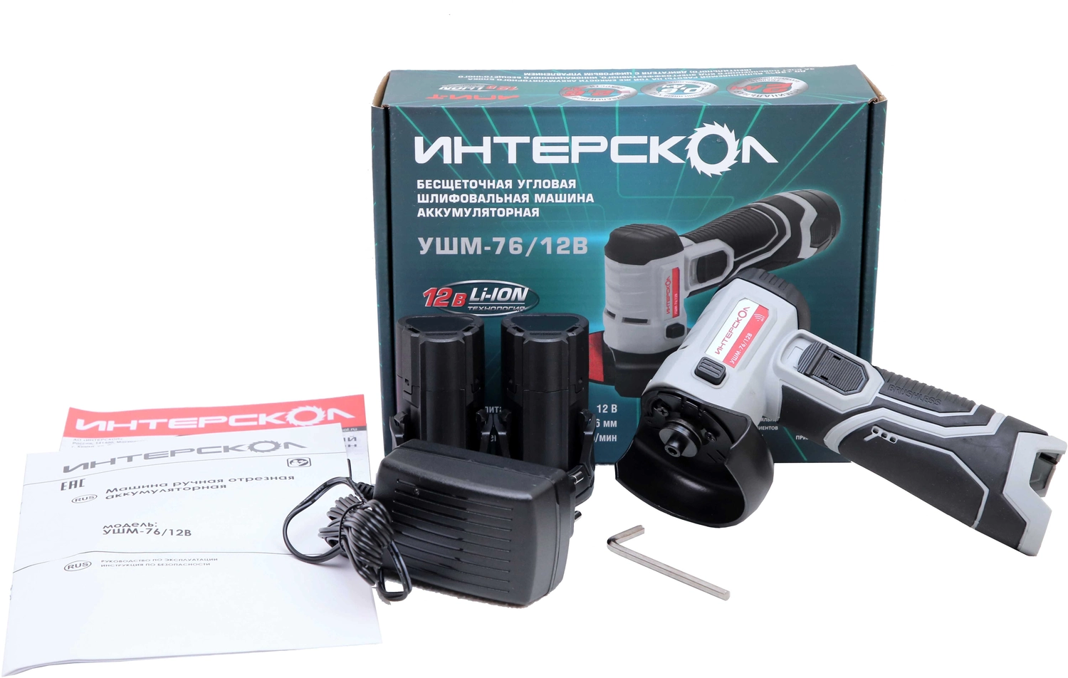 Бесщеточная аккумуляторная угловая шлифмашина (2 аккум. 2,0Ач, ЗУ) УШМ-76/12В ИНТЕРСКОЛ 644.2.2.70