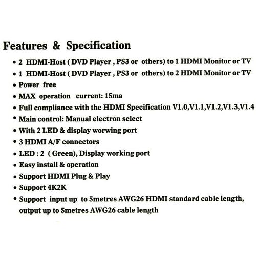 Данный переключатель может подключаться к 2 источникам видеосигнала HDMI или к одному источнику и двум мониторам для работы в режиме разветвителя. Поддерживается 4K Ultra HD (HDMI 2.0)