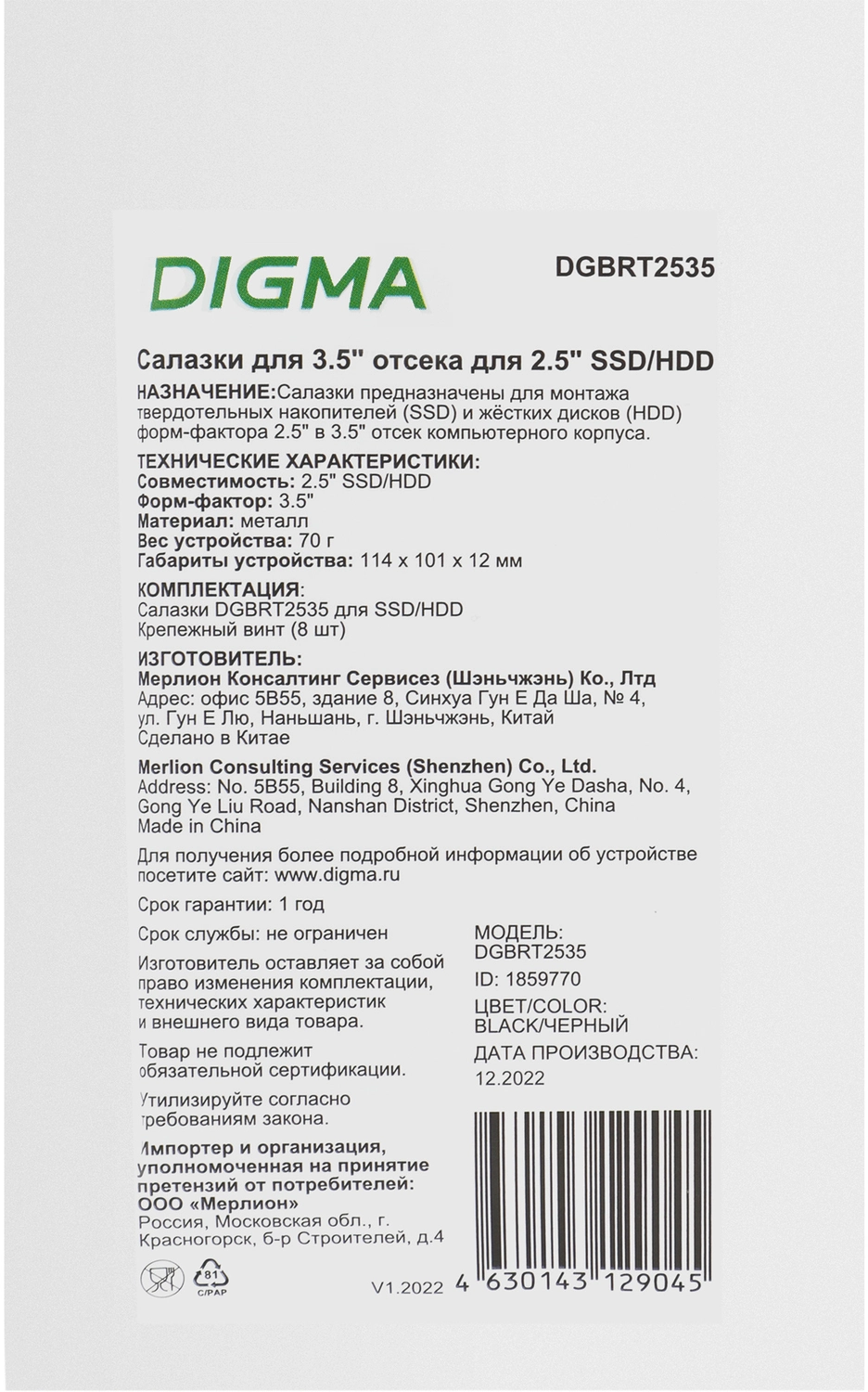 Салазки для 3.5" отсека Digma для HDD 2.5" DGBRT2535 металл