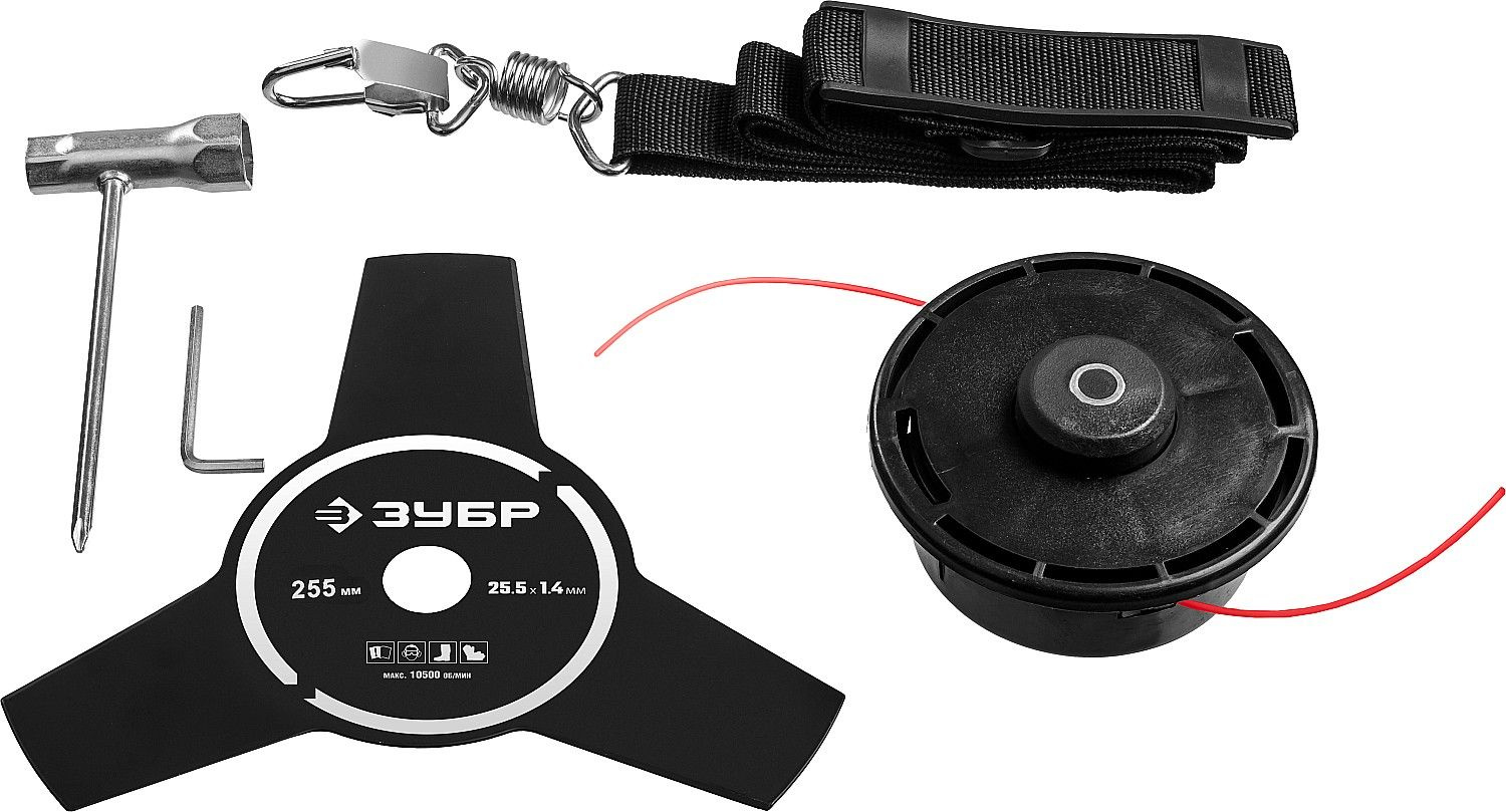 Триммер, Кожух защитный, Катушка с леской, Нож, Плечевой ремень, Рукоятка дополнительная с крепежом, Ключ, Руководство по эксплуатации