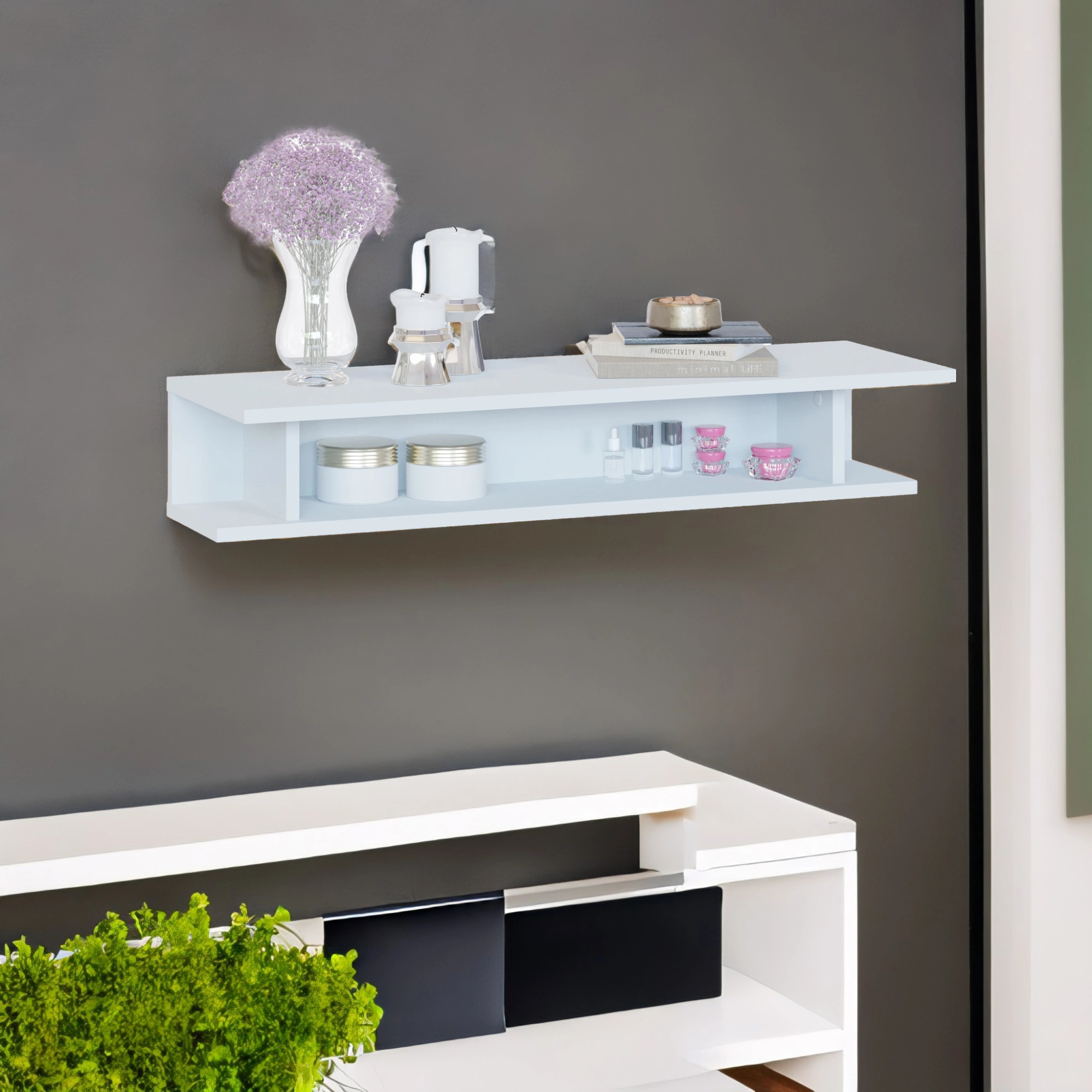 Подвесной столик может одновременно служить и полкой, поддерживая порядок и не загромождая пространство.