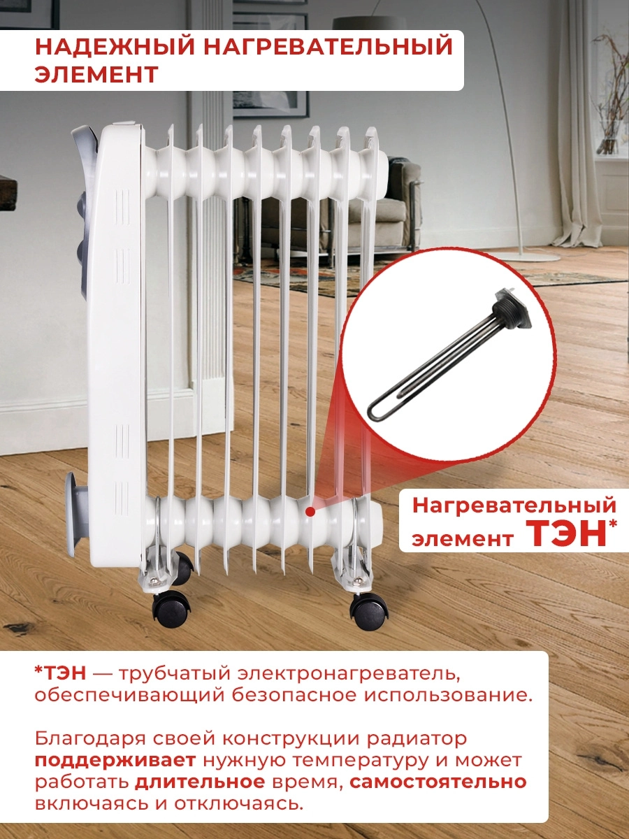 Масляный радиатор оснащен термостатом, что позволяет ему автоматически поддерживать в помещении заданную пользователем температуру. Существенным плюсом является и то, что он обладает низкой температурой корпуса, благодаря чему практически не выжигает кислород в помещении.