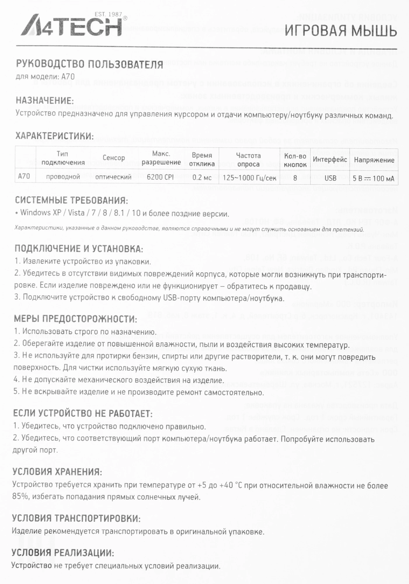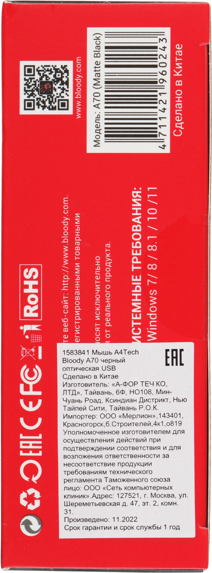 Мышь A4Tech Bloody A70 черный оптическая 6200dpi USB 8but (A70 MATTE BLACK)
