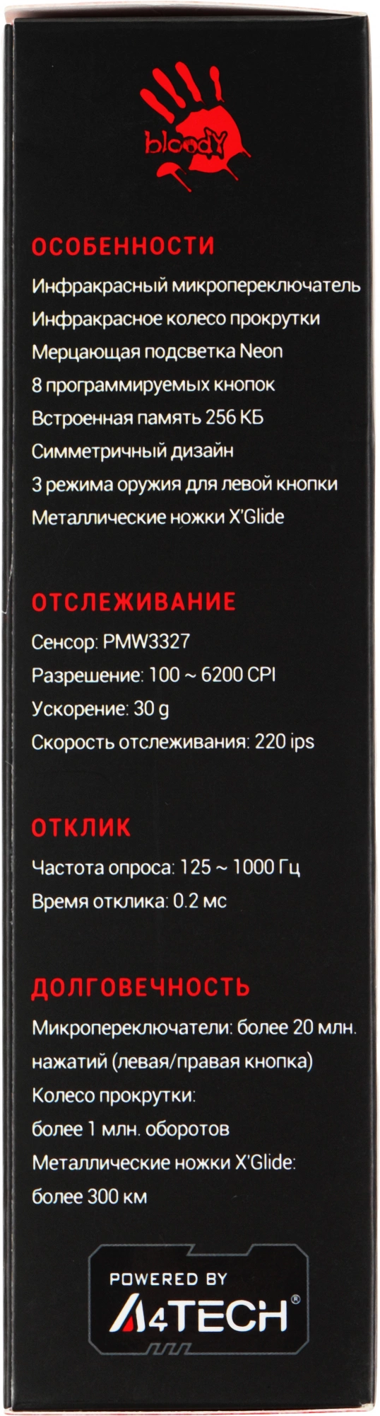 Молниеносный отклик. Время отклика – до 0.2 мс. Высокая долговечность - более 20 млн нажатий. Отсутствие металлического дребезжания при нажатии. Используются переключатели LK. Подсветка рисунка Neon. Игровой сенсор Pixart PMW3327. поддержка функции Drug click