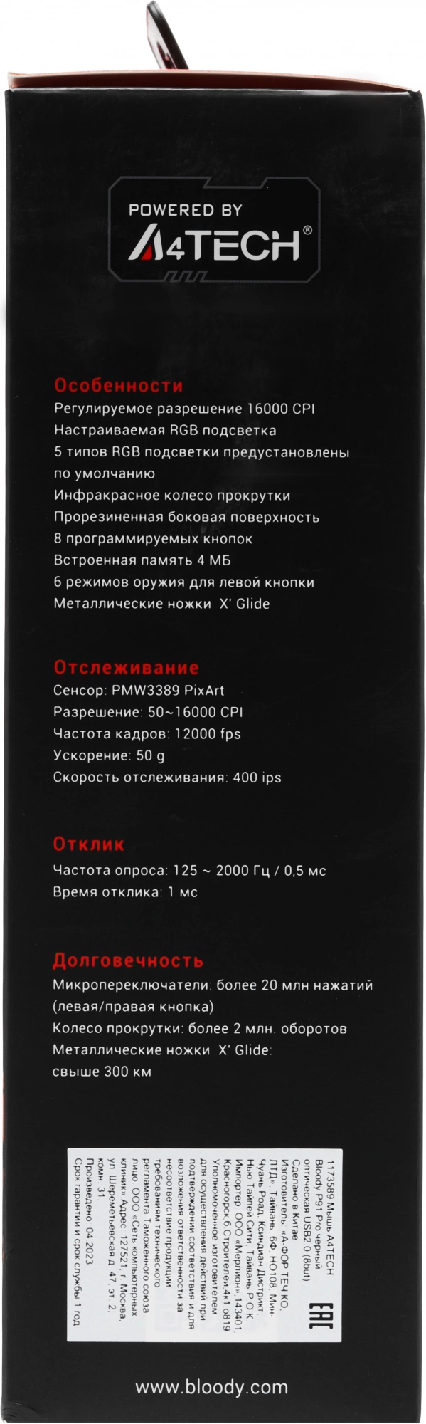 Sensor: PixArt PMW3389 Gaming Engine. 400 ips. RGB-подсветка. Прорезиненный инфракрасный скролл. Система 4 Core. Металлические ножки X'Glide. 6 режима стрельбы для левой кнопки. Время отклика 1 мс.