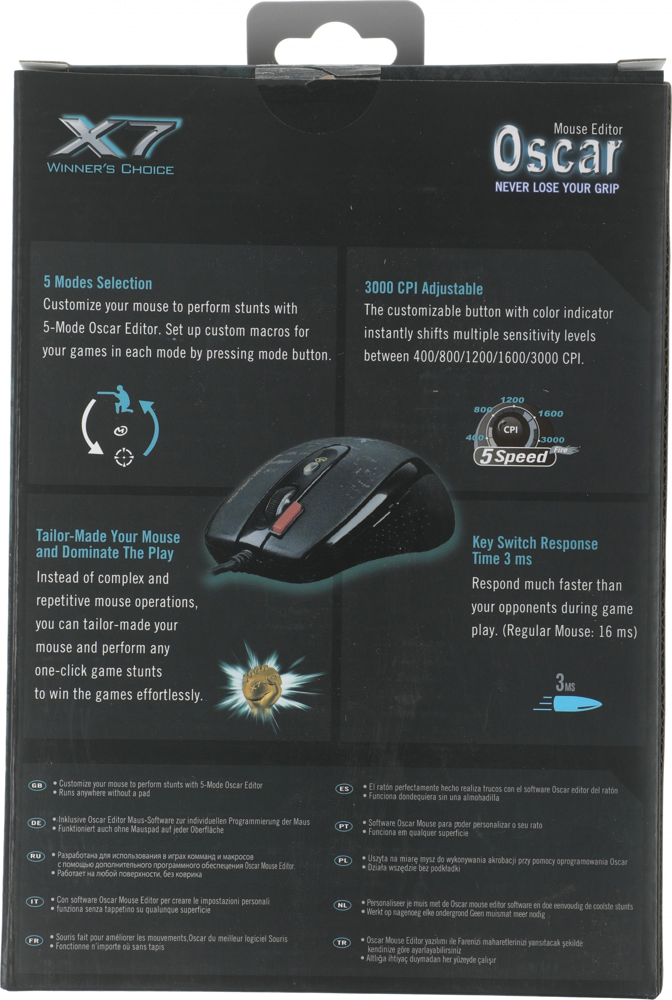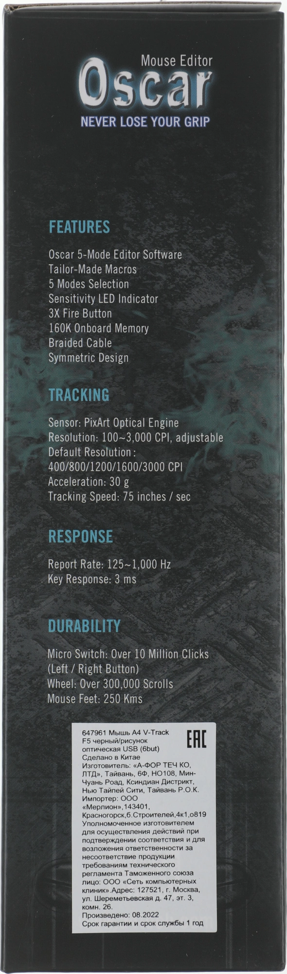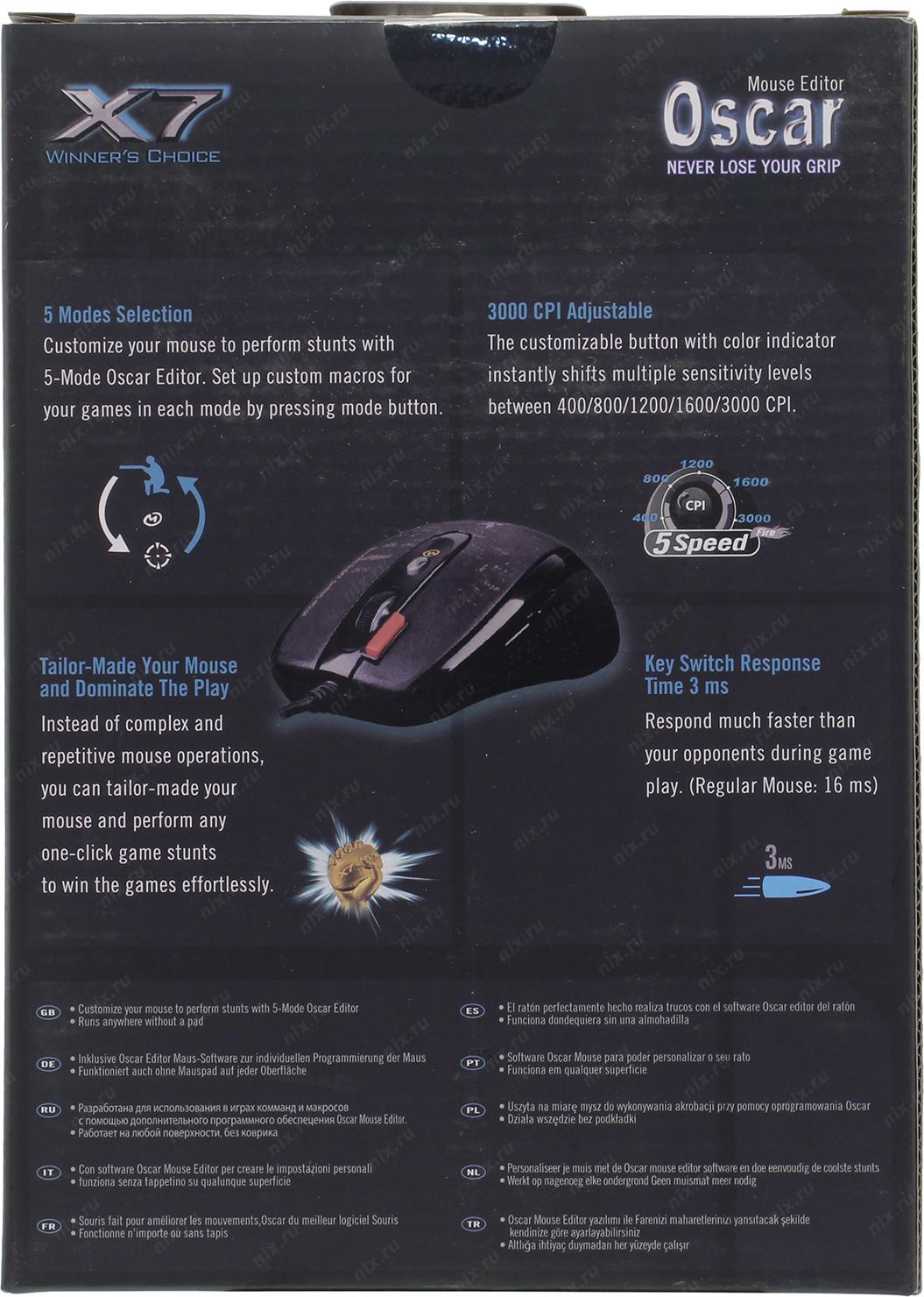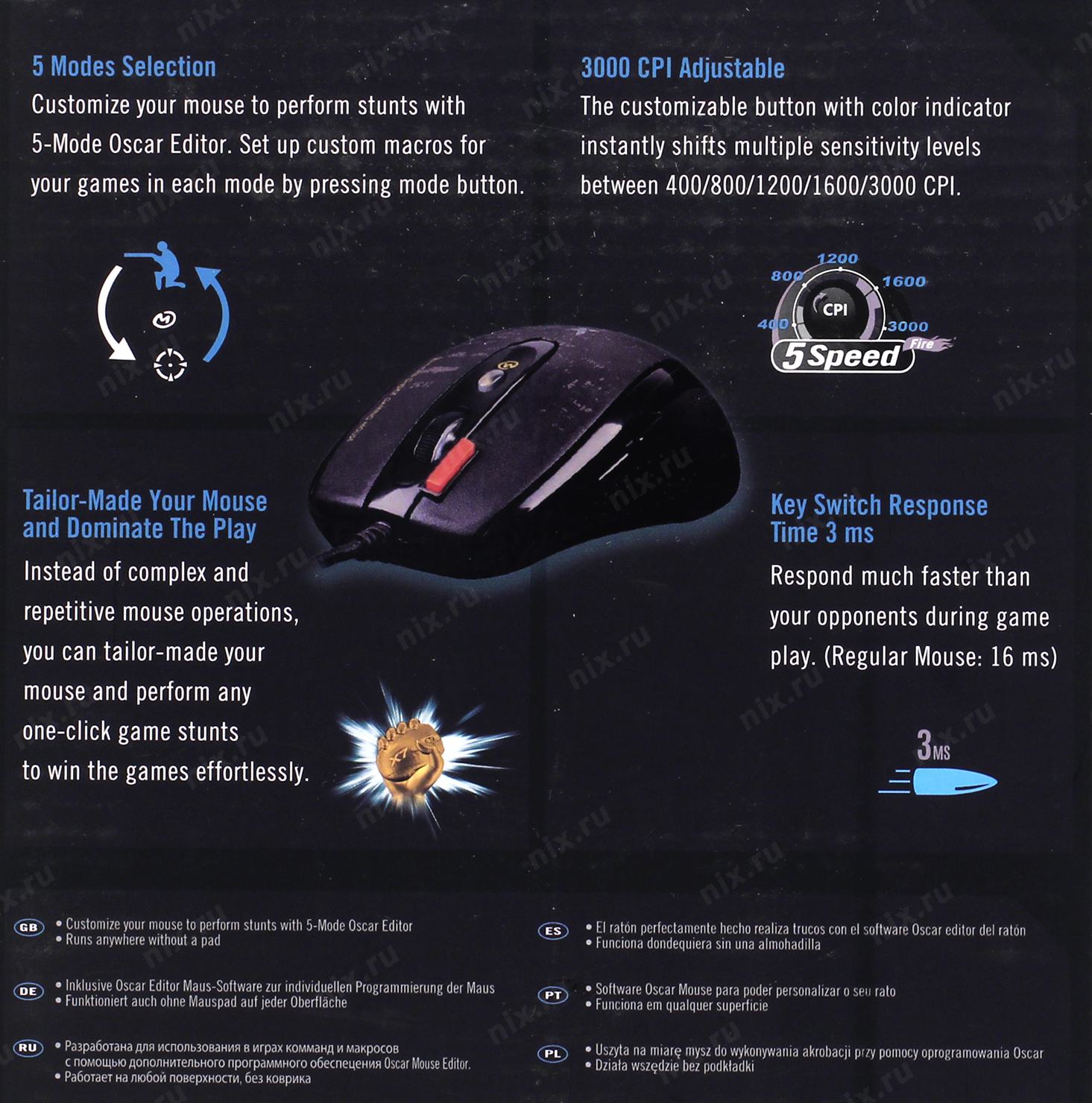 Минимальное время отклика (SPI) - 3 мс;;Каждую кнопку мыши можно настроить под любые команды клавиатуры;;Ребристая вставка на левой боковой панели