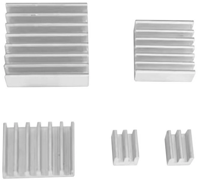 Комплект из пяти кулеров - 17x17x6мм (1шт), 14x10x6мм (1шт), 12x12x5мм (1шт), 5x5x6мм (2шт). Предназначен для отвода тепла от компонентов Raspberry Pi 5, улучшая теплоотведение и предотвращая перегрев. Радиаторы изготовлены из алюминия, что способствует эффективному рассеиванию тепла.