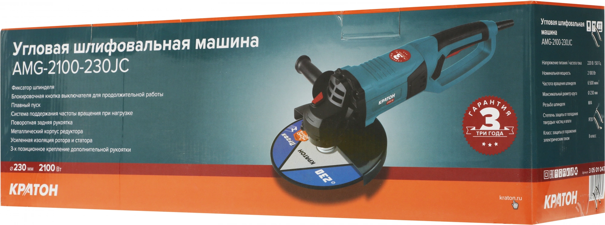 Углошлифовальная машина Кратон AMG-2100-230JC 2100Вт 6000об/мин рез.шпин.:M14 d=230мм (3 05 01 047) | НИКС Екатеринбург