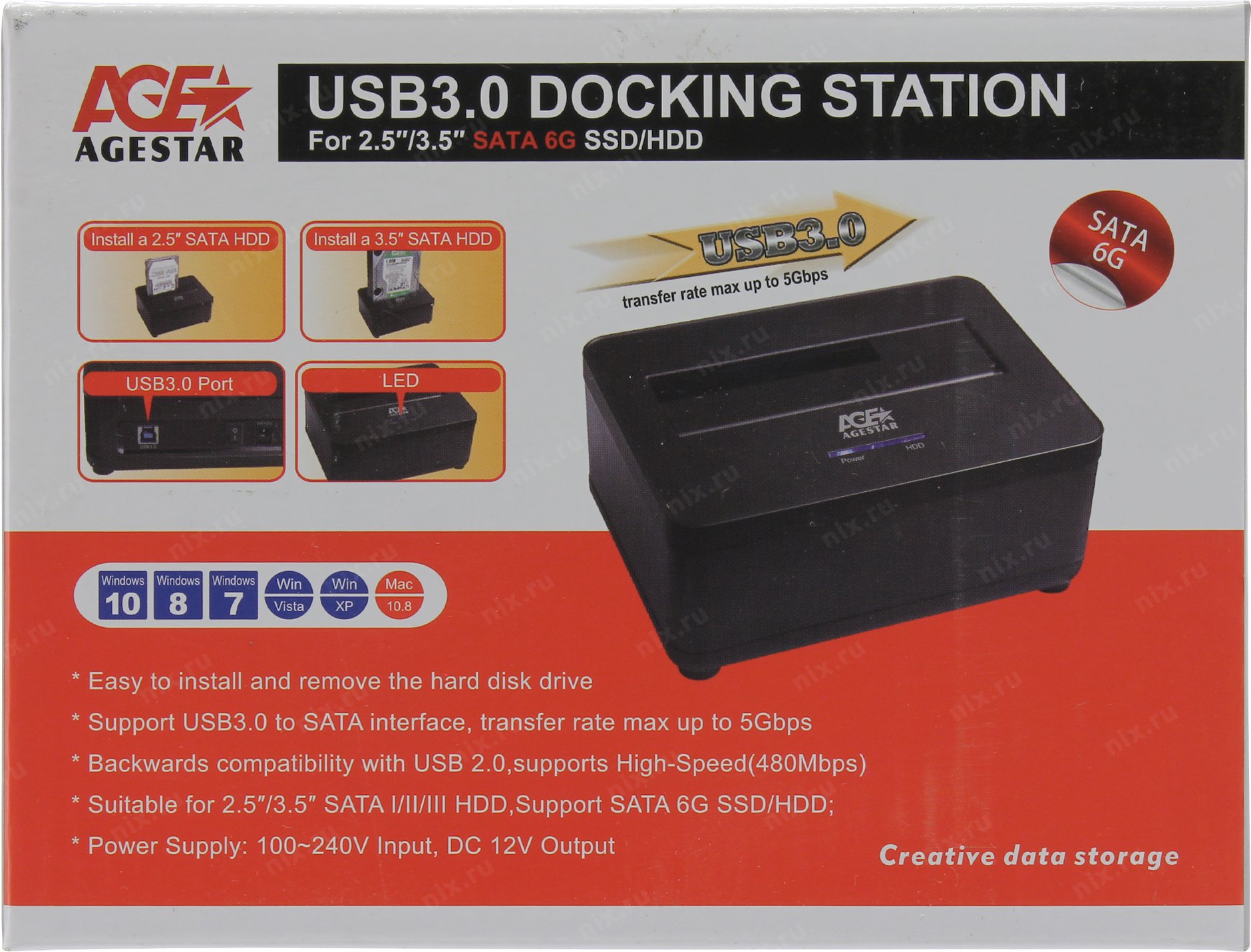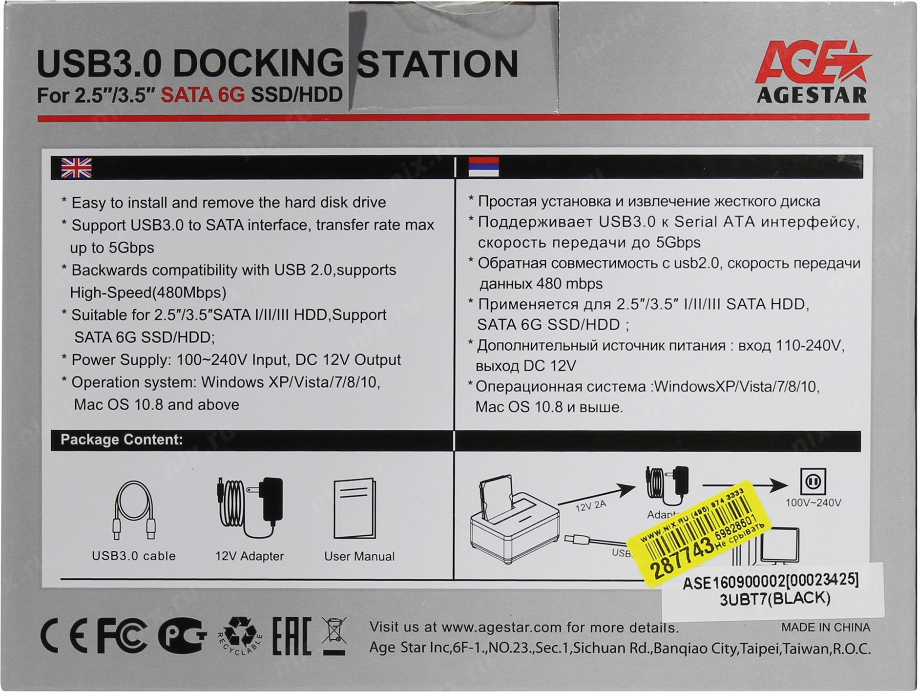 Контейнер для HDD AgeStar 3UBT7 (BLACK) Докстанция 2,5"/3,5" SATAIII AgeStar 3UBT7 (BLACK) USB 3.0, пластик, черная [3UBT7(BLACK)]