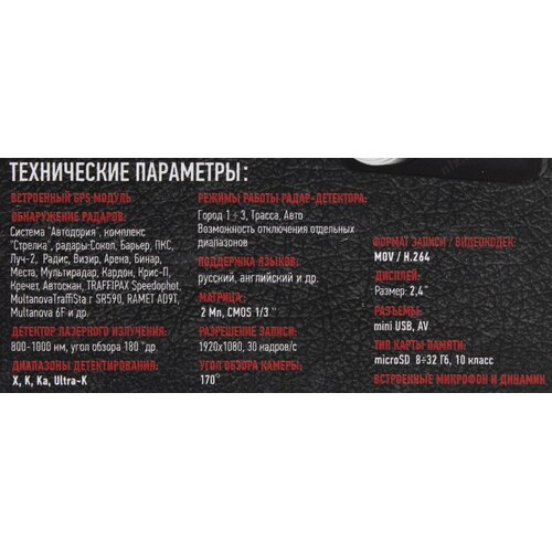 Встроенный высокочувствительный радар-детектор, адаптированный к российским камерам ДПС комплекса «Стрелка»;;Режимы работы радар-детектора: Город1/ Город2/ Город3/Трасса.;;Рабочие диапазоны: ;;;;X-диапазон (Сокол, Барьер): 10425 - 10625 МГц;;K-диапазон (Радис, Визир, Арена, Места, Мультарадар, Кордон, Крис-П): 24050 - 24250 МГц;;Ka диапазон: 33400 - 36000 МГц;;Детектор лазерного излучения (Poliscan, TruCam, UltraLite, Лисд-2, Амата): 800 - 1000 нм;;Импульсные режимы: Ultra-K, Ultra-X, POP;;Дополнительный свободный разъём прикуривателя на блоке питания;;GPS-информатор: оповещение о превышении скорости, установка порога скорости, установка точек тишины, установка пользовательских точек оповещения