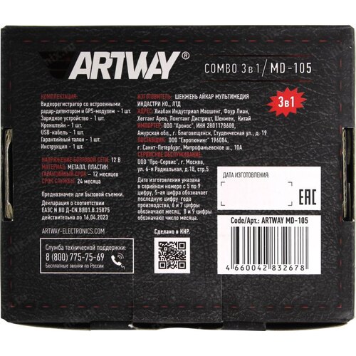 Видеорегистратор с радар-детектором Artway COMBO MD-105 GPS черный ARTWAY MD-105