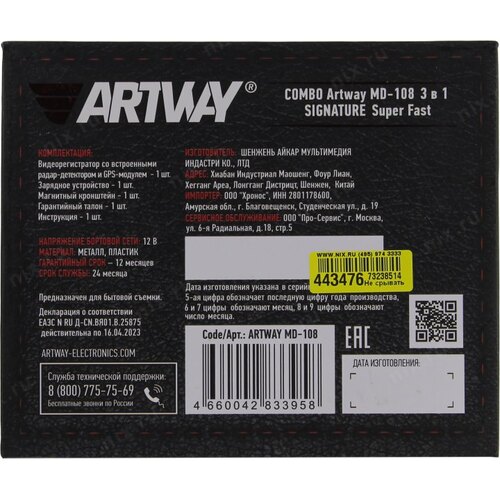 Видеорегистратор с радар-детектором Artway MD-108 GPS черный