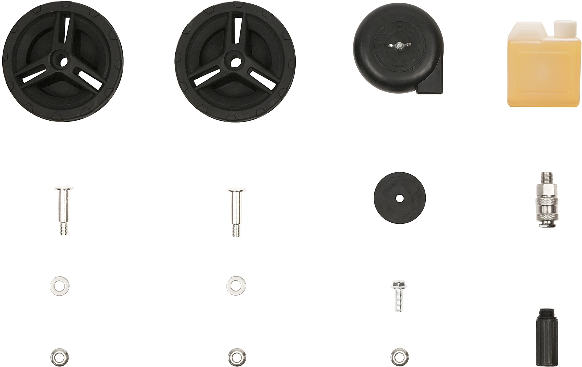 Компрессор, бутылочка с маслом, фильтр воздушный, набор крепежный, опора резиновая, колеса - 2 шт., сапун.