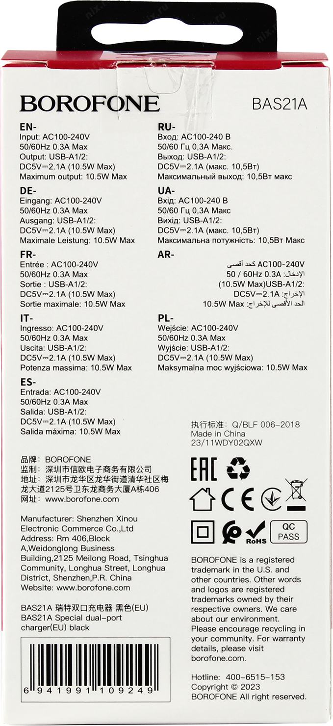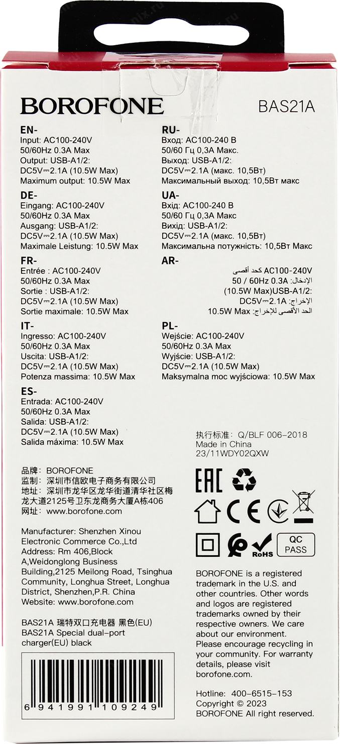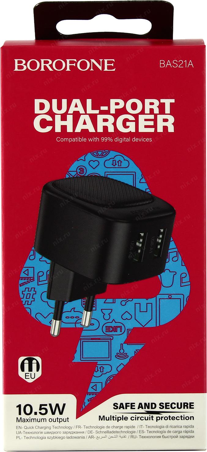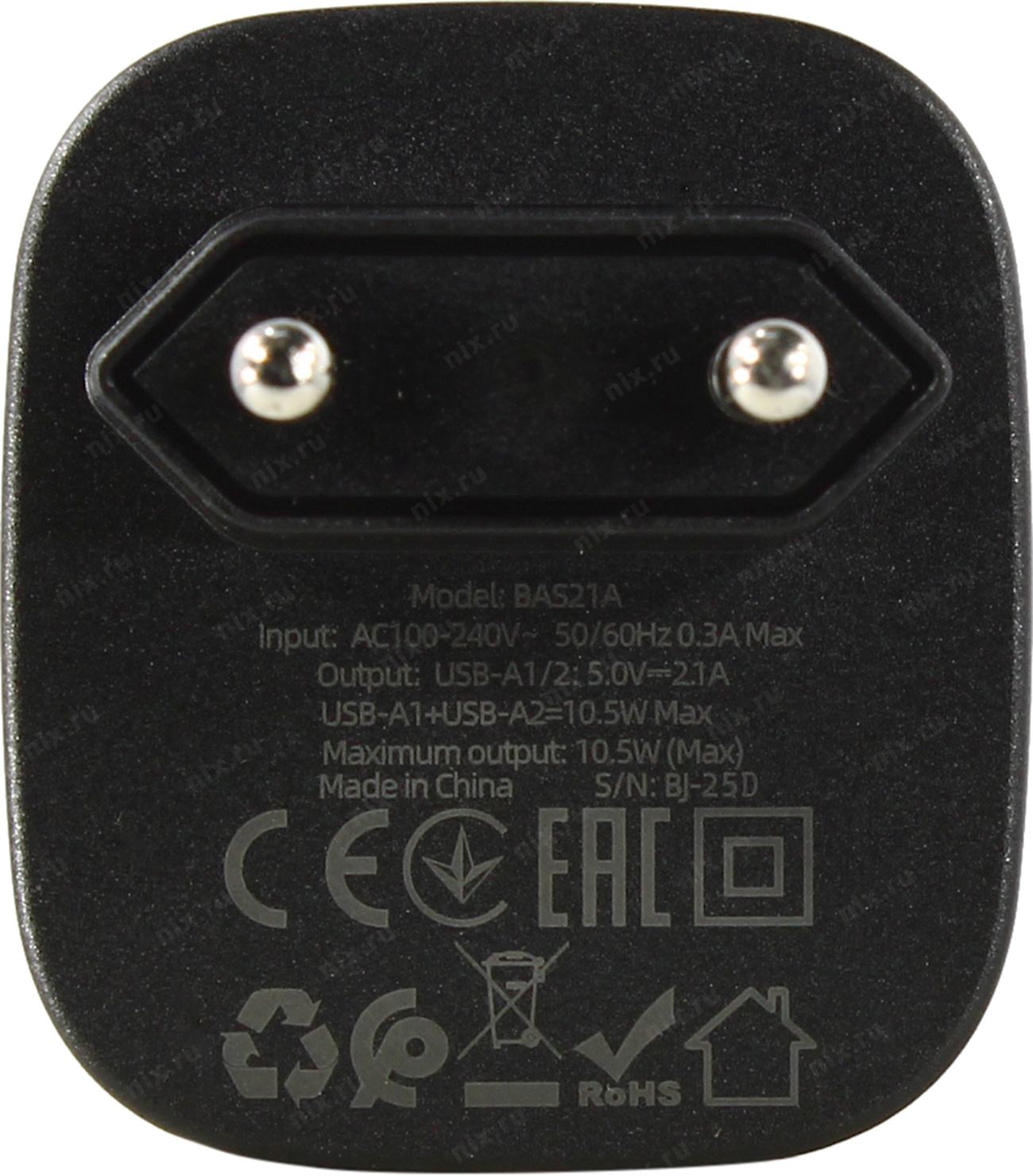 BOROFONE BAS21A Black < 109249> Зарядное устройство USB (Вых. DC5V, 10.5W, 2xUSB)