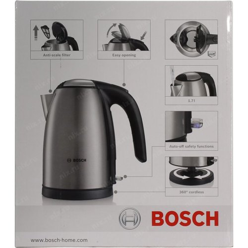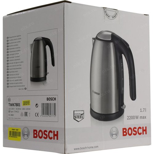 Чайник BOSCH TWK7801 Чайник, 2200Вт, нержавеющая сталь, серебристый-черный | НИКС Екатеринбург