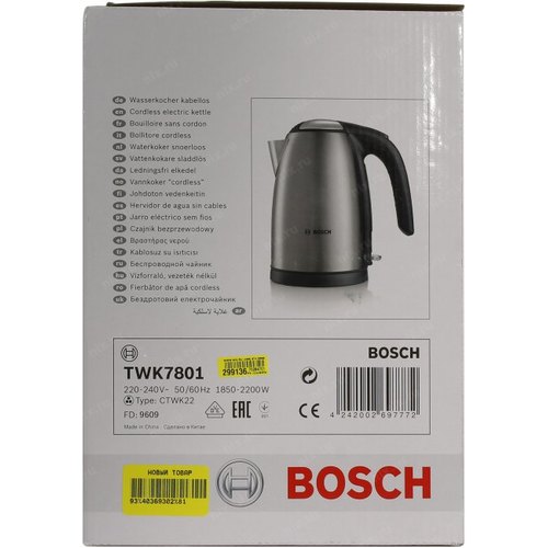 Чайник BOSCH TWK7801 Чайник, 2200Вт, нержавеющая сталь, серебристый-черный