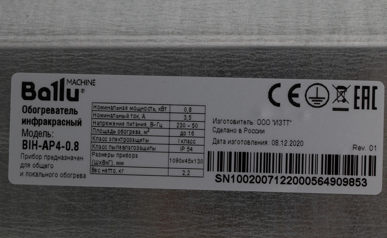 Обогреватель инфракрасный Ballu BIH-AP4-0.8 800Вт серебристый