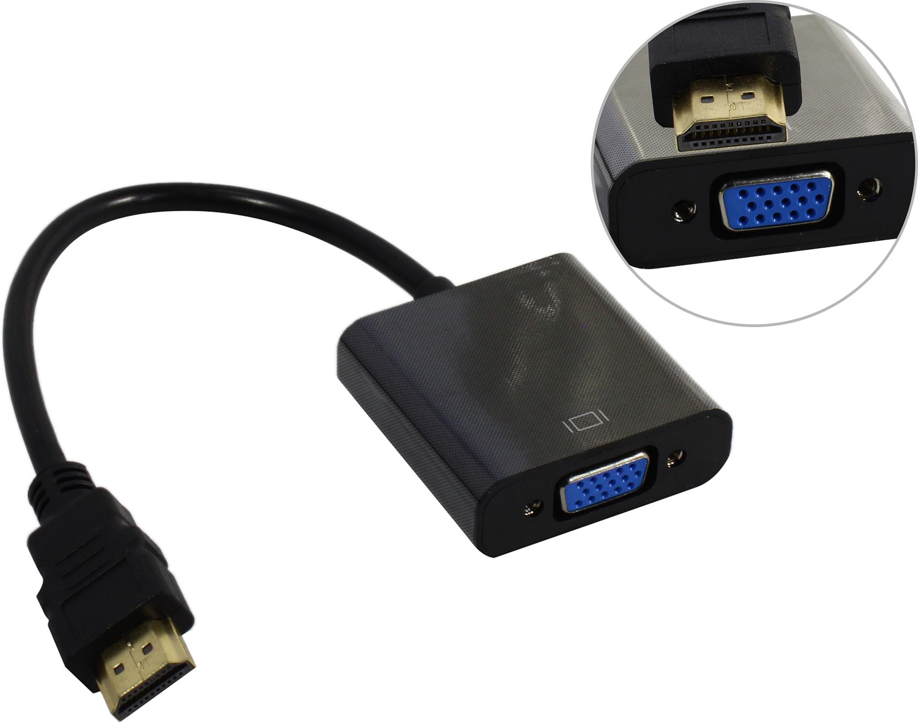 Адаптер на коротком кабеле для подключения монитора/телевизора/проектора со входом VGA к видеокарте с выходом HDMI. Не позволяет вывести аудиосигнал.