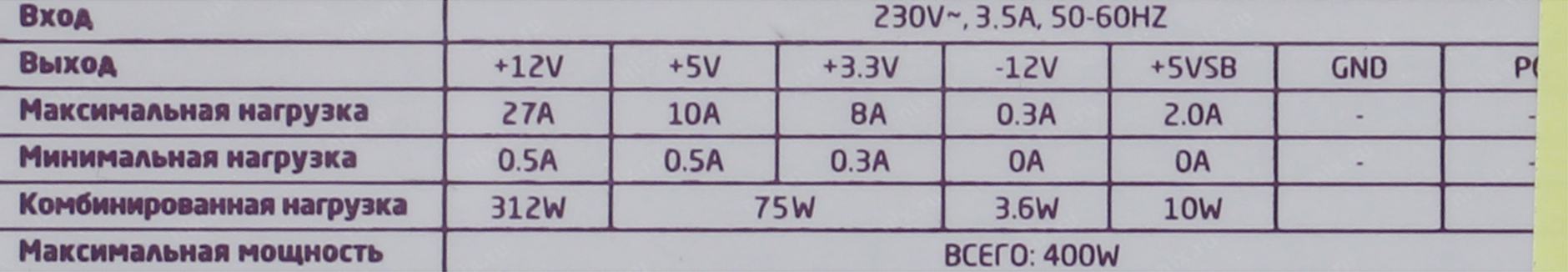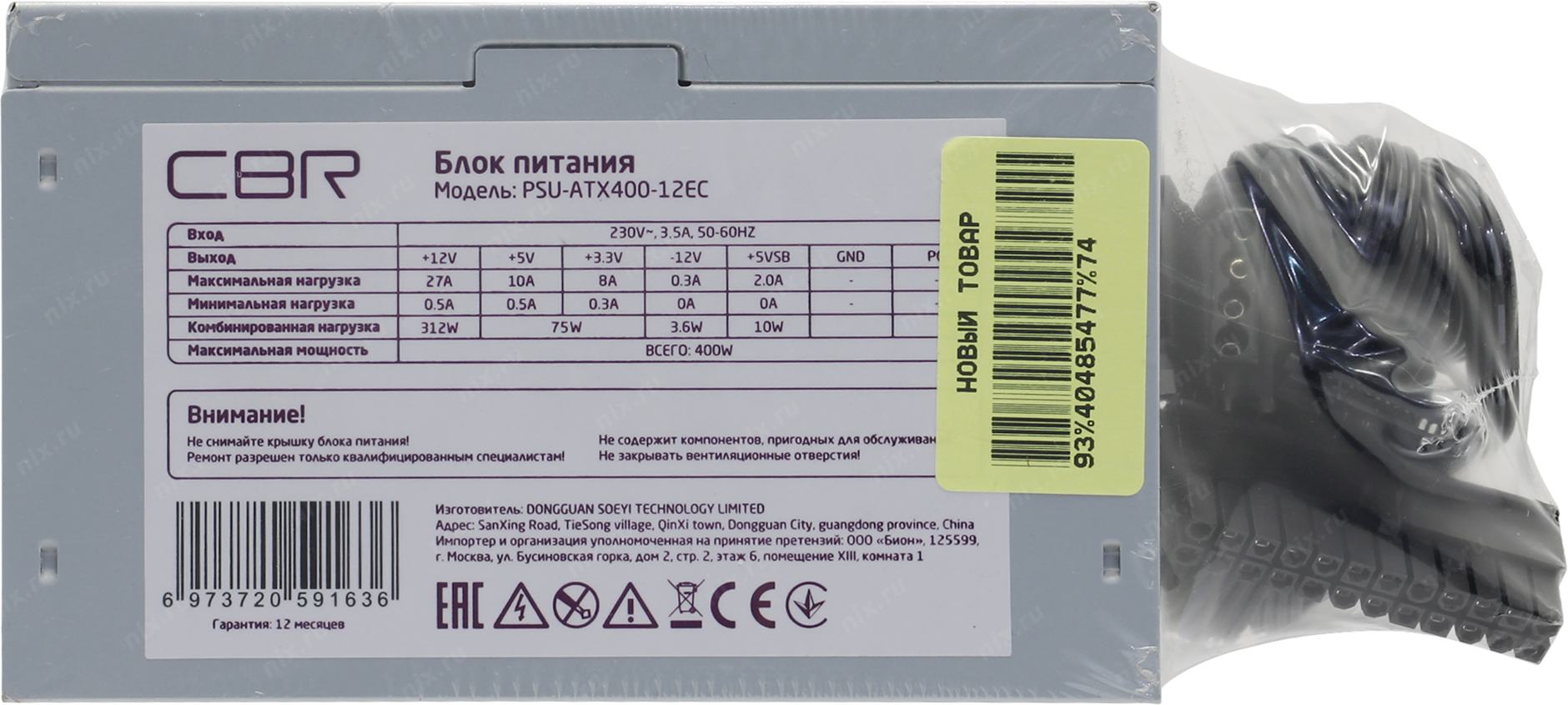 Блок питания CBR ATX 400W, 12см fan, 24pin/1*4pin/1*IDE/2*SATA, кабель питания 1.2м, черный [PSU-ATX400-12EC] OEM