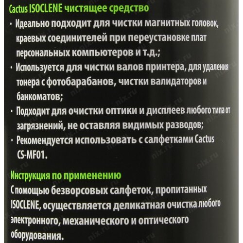Идеален для чистки магнитных головок, краевых соединителей при переустановке плат ПК и т.д. Используется для чистки валов принтера, удаления тонера с фотобарабанов, чистки валидаторов, банкоматов. Подходит для очистки оптики и дисплеев любого типа от загрязнений, не оставляя видимых разводов.