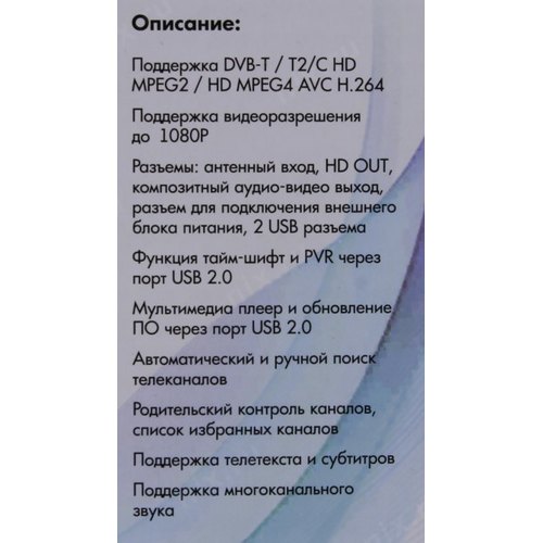 Цифровой телевизионный приемник DVB-T2/DVB-C с расширенным функционалом. Устройство имеет возможность выхода в интернет через приобретаемый отдельно WiFi-адаптер для просмотра IP-ТВ и фильмов из онлайн-кинотеатра Megago. При подключении к интернет, доступны сервисы YouTube, погода, чтение RSS-лент и прочее. Также есть все атрибуты медиаплеера. Для записи эфирного телевидения можно использовать приобретаемые отдельно внешние USB-накопители для хранения данных. Пульт ДУ в комплекте, мощный процессор и меню на русском языке.