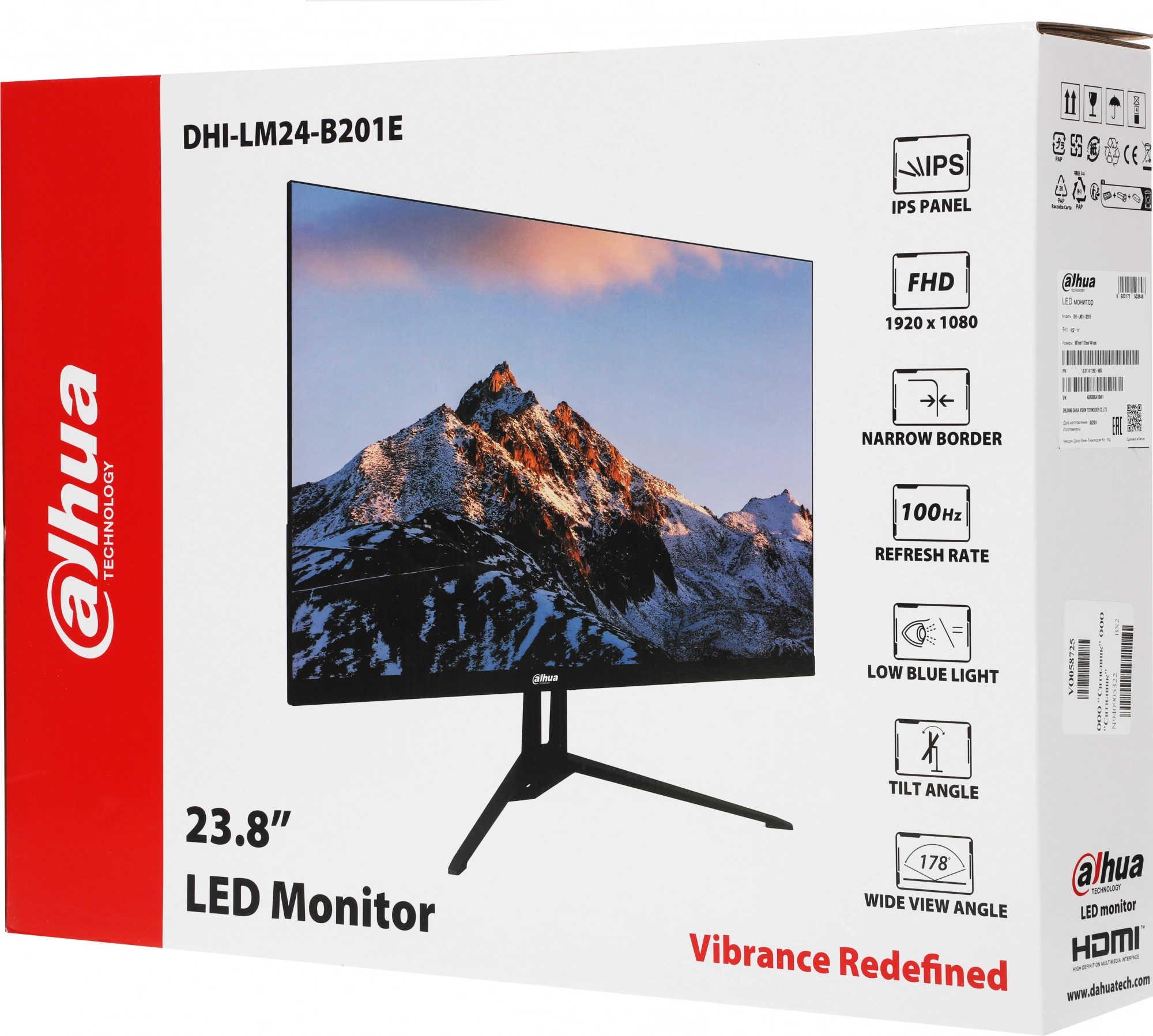Монитор Dahua DHI-LM24-B201E 23.8"(16:9) FullHD монитор IPS E-LED 1920x1080 300 кд/м2 1000:1 178°/178° 7 мс 100Гц 16.7Млн (8 бит) VESA: 75X75 VGA HDM DP Аудио выход