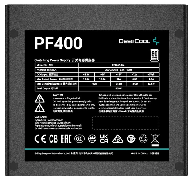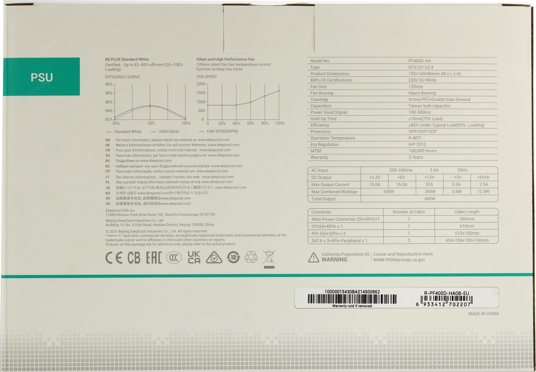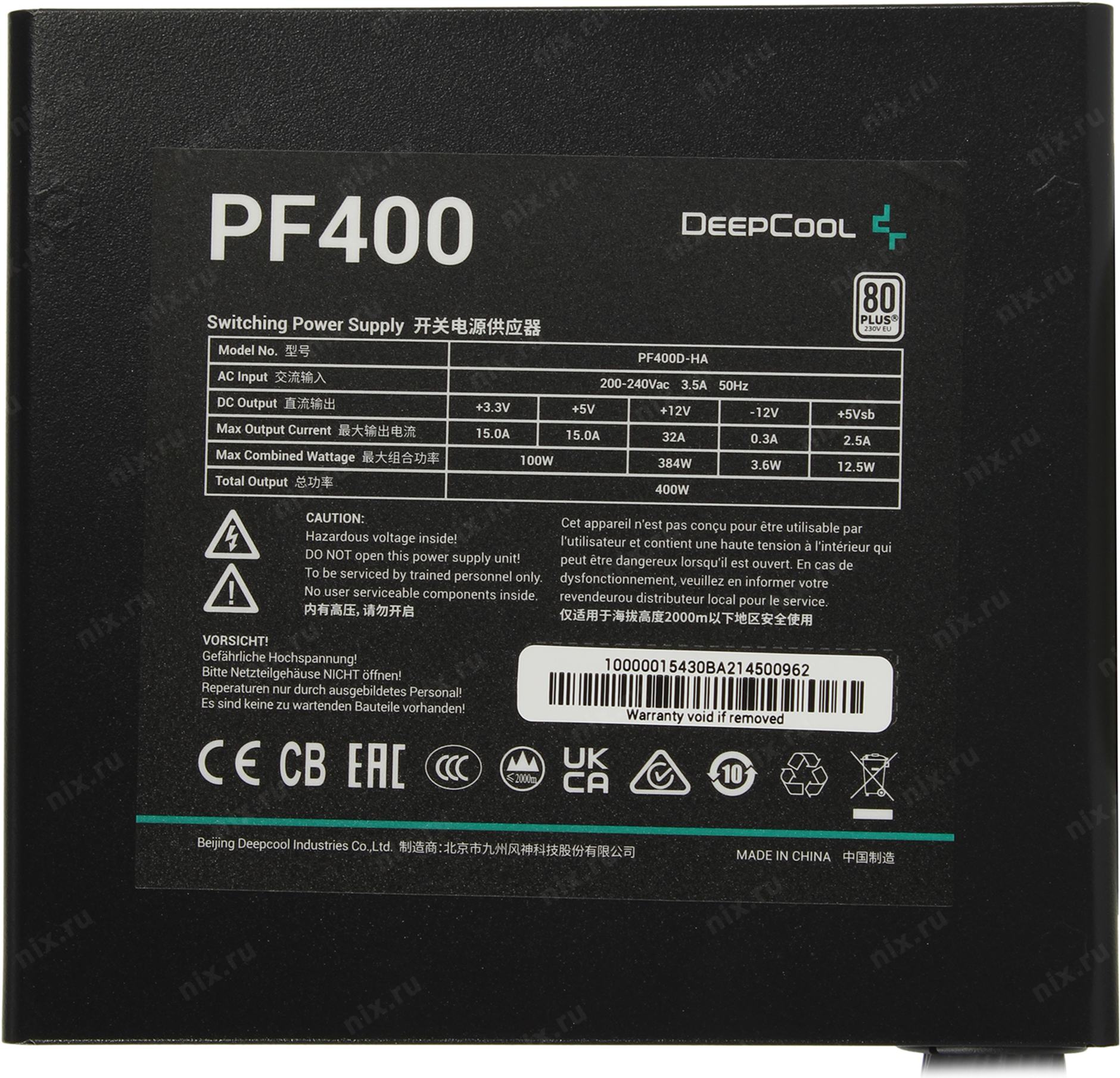 Блок питания Deepcool ATX 400W PF400 80 PLUS 24+2x(4+4) pin APFC 120mm fan 6xSATA RTL [R-PF400D-HA0B-EU]