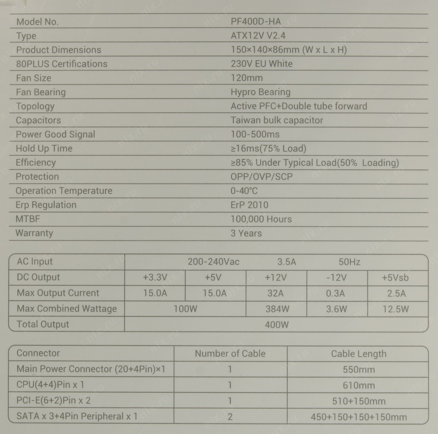 +3.3V - 15A, +5V - 15A, +12V -32A, +5VSB - 2.5A, -12V - 0.3A; Комбинированная нагрузка: +3.3V & +5V - 100 Вт