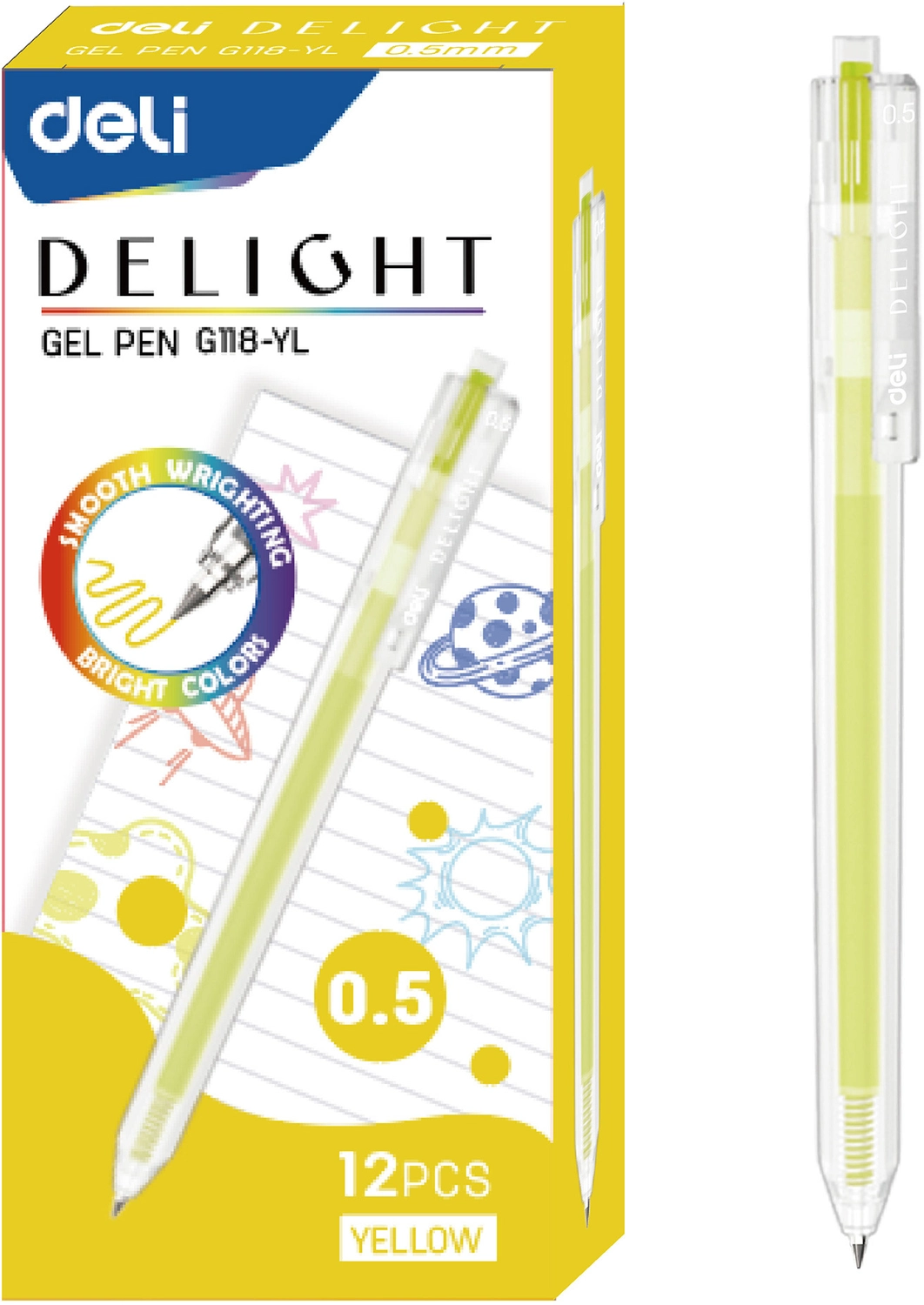 Ручка гелев. Deli Delight EG118-YL прозрачный жел. черн. линия 0.5мм (продается кратно 12 шт.)