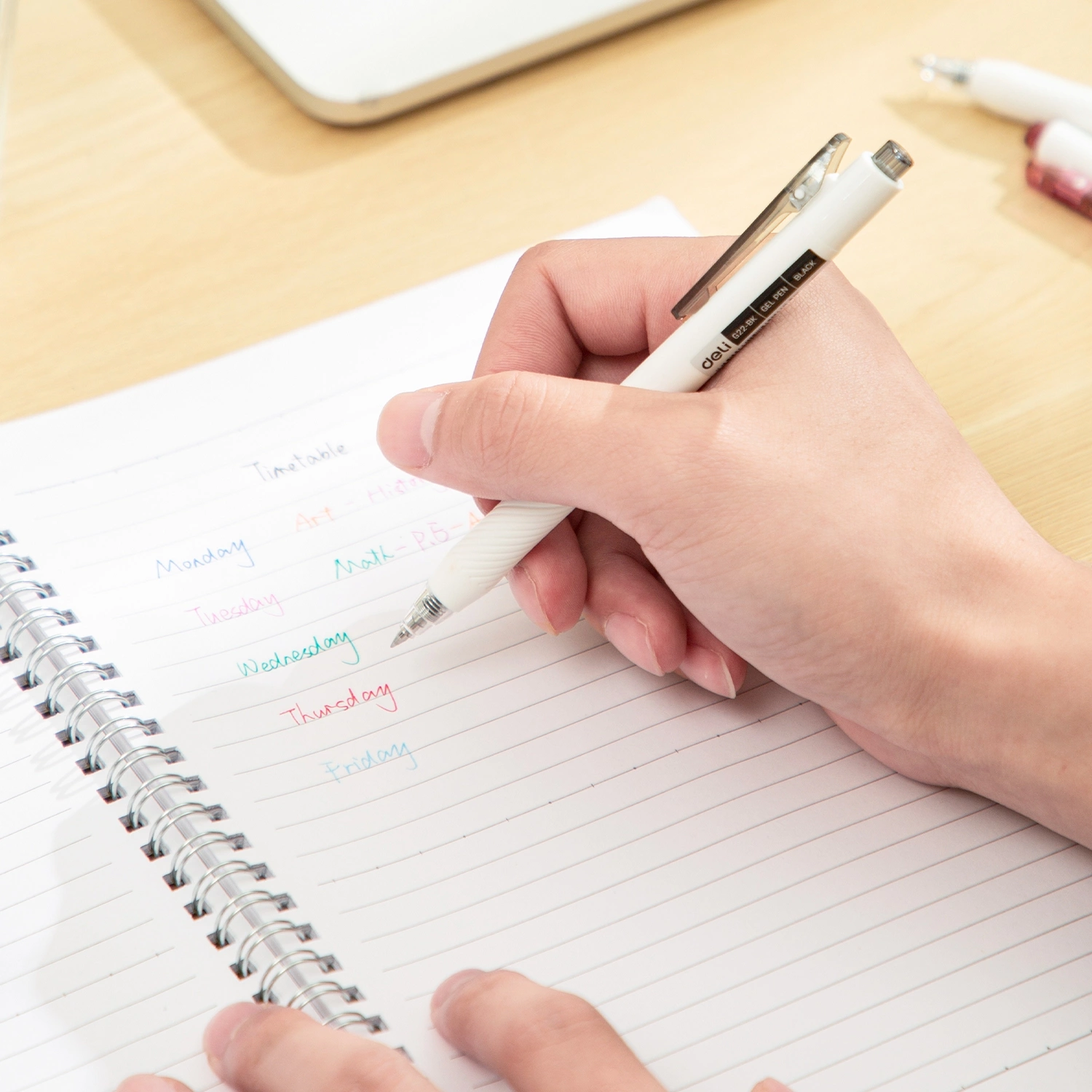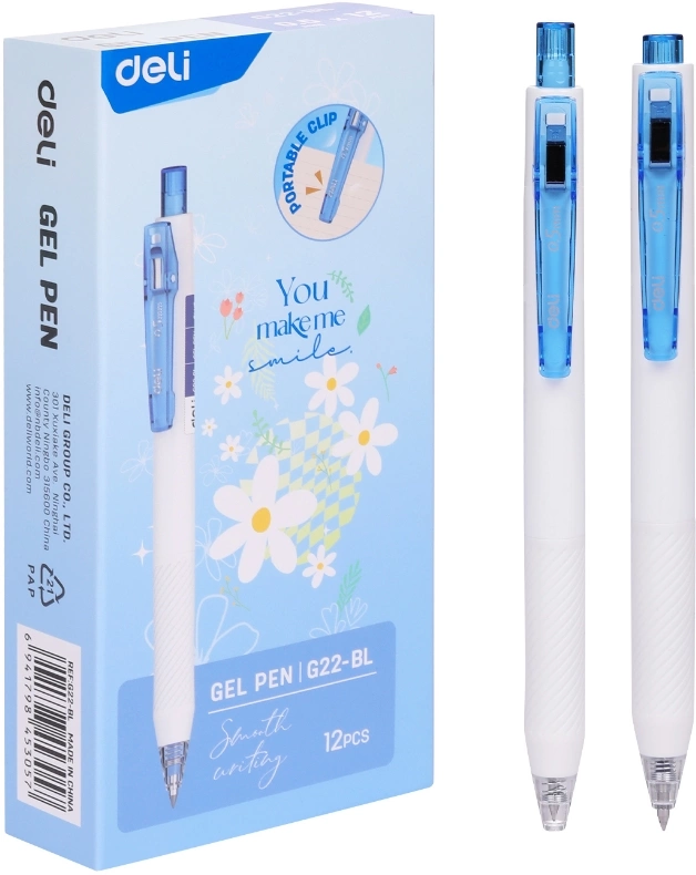 Ручка гелевая автоматическая Deli, EG22-BL, синяя, 0,5мм, белый корпус, клип-прищепка, мягкое письмо, картонная коробка