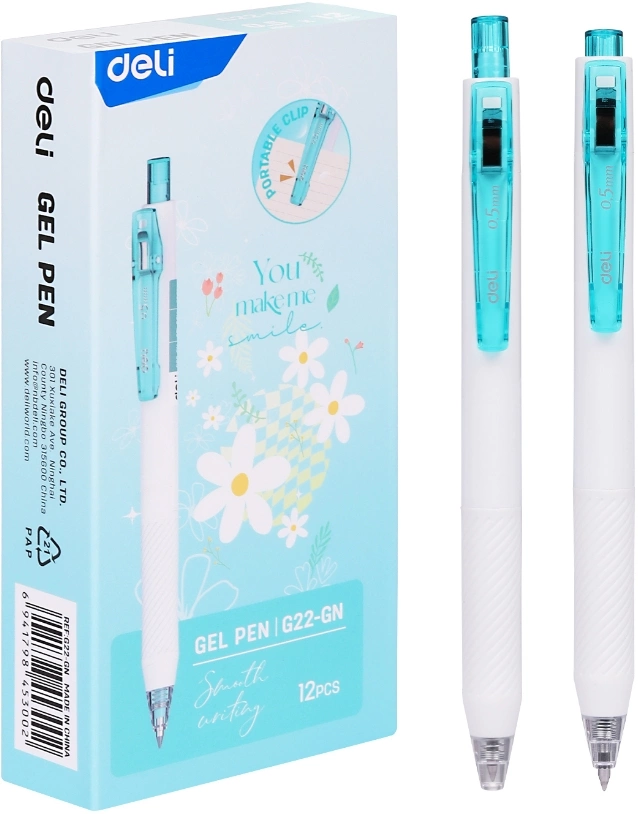 Ручка гелевая автоматическая Deli, EG22-GN, зеленая, 0,5мм, белый корпус, клип-прищепка, мягкое письмо, картонная коробка
