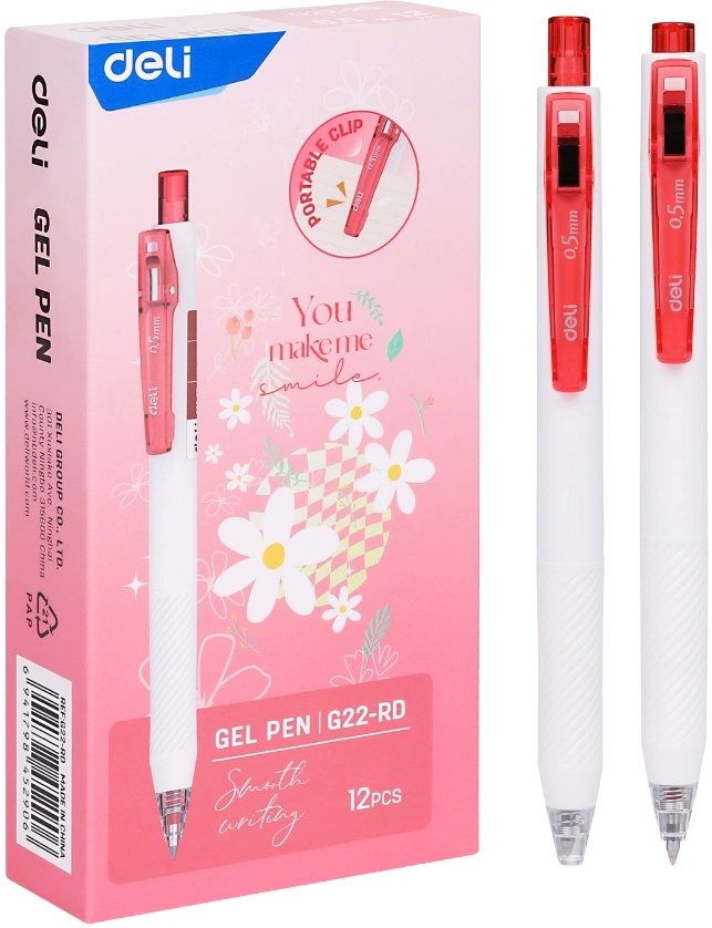 Ручка гелевая автоматическая Deli, EG22-RD, красная, 0,5мм, белый корпус, клип-прищепка, мягкое письмо, картонная коробка
