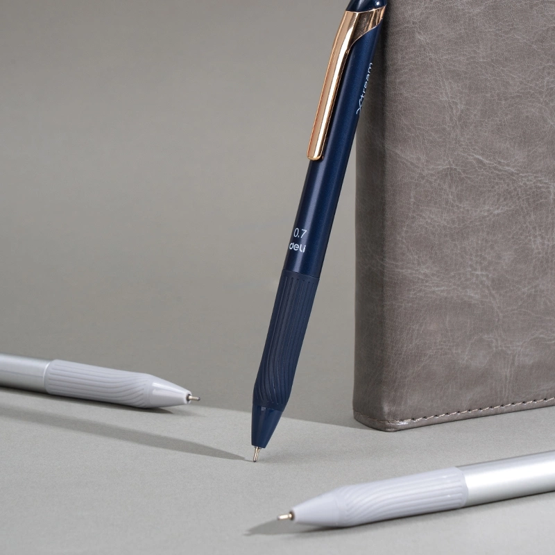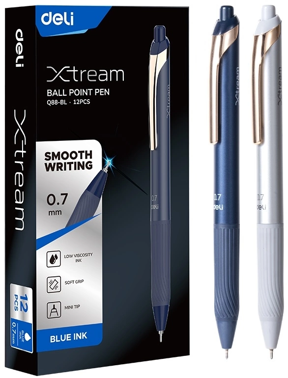 Ручка шариков. автоматическая Deli EQ88-BL d=0.7мм син. черн. карт.уп. игловидный пиш. наконечник резин. манжета чернила пониженной вязкости (продается кратно 12 шт.)