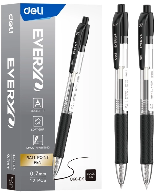 Ручка шариков. автоматическая Deli EveryU EQ60-BK прозрачный/черный d=0.7мм черн. черн. пулевидный пиш. наконечник кругл. резин. манжета