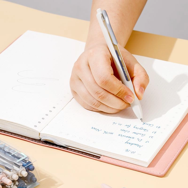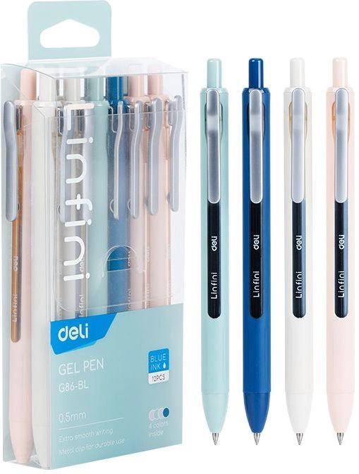 Гелевая ручка Deli EG86-BL, пулевидный наконечник, пишущий узел 0,5 мм, металлический клип, упаковка 12 штук, 4 цвета ассорти, чернила синие