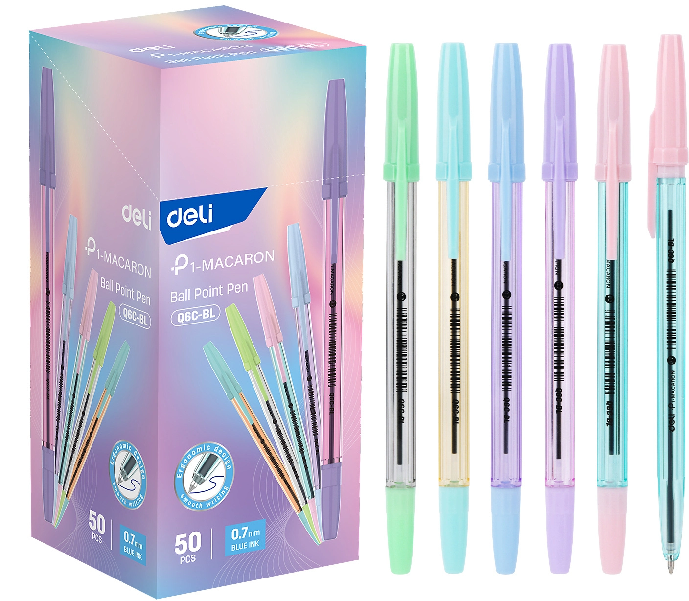 Ручка шариков. Deli P1-Macaron EQ6C-BL ассорти/прозрачный d=0.7мм син. черн. (продается кратно 50 шт.)