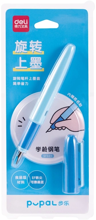 Стираемая перьевая ручка Deli SF321, толщина пера EF, эргономичный грип, синий цвет корпуса, синие чернила, блистер
