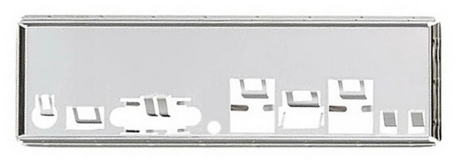 Заглушка имеет 10 вырезов под разъемы USB (4шт), аудио-порты (2шт), RJ45 (1шт), Serial port DB9 (1шт), HDMI (1шт), DC-in (1шт) и один вырез для кнопки сброса CMOS