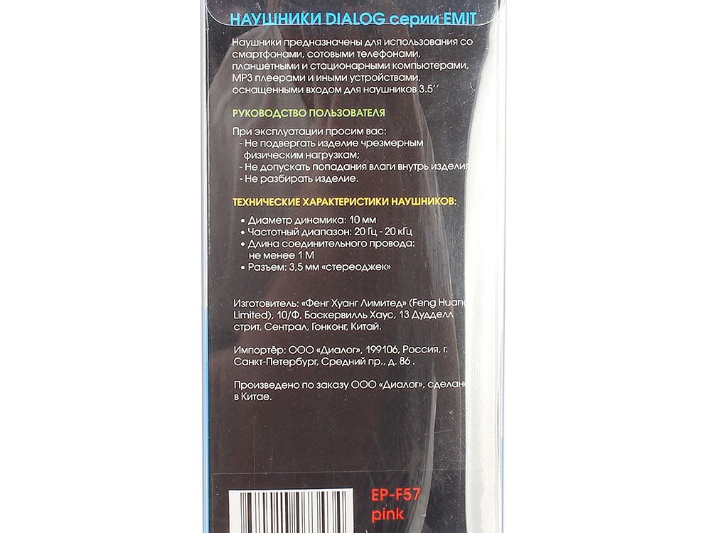 Dialog EP-F57 - бюджетные наушники-вкладыши, рассчитанные на самых неприхотливых. Очень компактны и удобны в эксплуатации, а также могут похвастаться неплохой звукоизоляцией за счет своей конструкции.;;В комплекте уже имеются сменные амбушюры, поэтому вариант с выскальзывающими или же, напротив, давящими на уши динамиками полностью исключен.;;Модель использует стандартный разъем 3,5 мм, поэтому использовать Dialog EP-F57 можно в связке с любыми гаджетами: смартфонами, планшетами, MP3-плеерами и так далее.;;Алюминиевый корпус чашек служит отличной защитой от внешних воздействий.