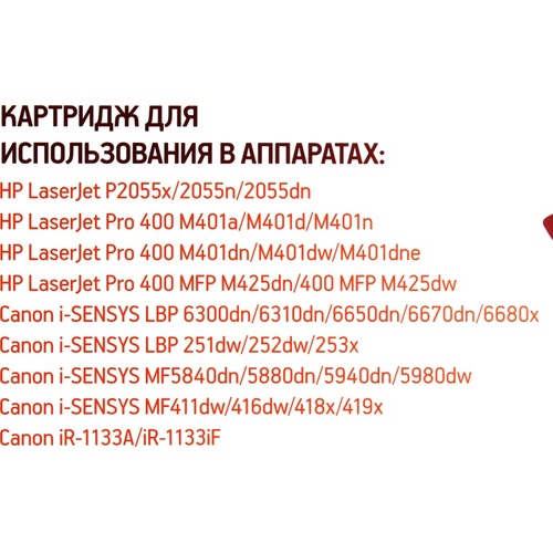 HP LaserJet P2055x, P2055n, P2055dn, LaserJet Pro 400 M401a, M401d, M401n, M401dn, M401dw, M401dne, MFP M425dn, MFP M425dw, Canon i-SENSYS LBP6300dn, LBP6310dn, LBP6650dn, LBP6670dn, LBP6680x, LBP251dw, LBP252dw, LBP253x, MF5840dn, MF5880dn, MF5940dn, MF5980dw, MF411dw, MF416dw, MF418x, MF419x, iR-1133A, iR-1133iF