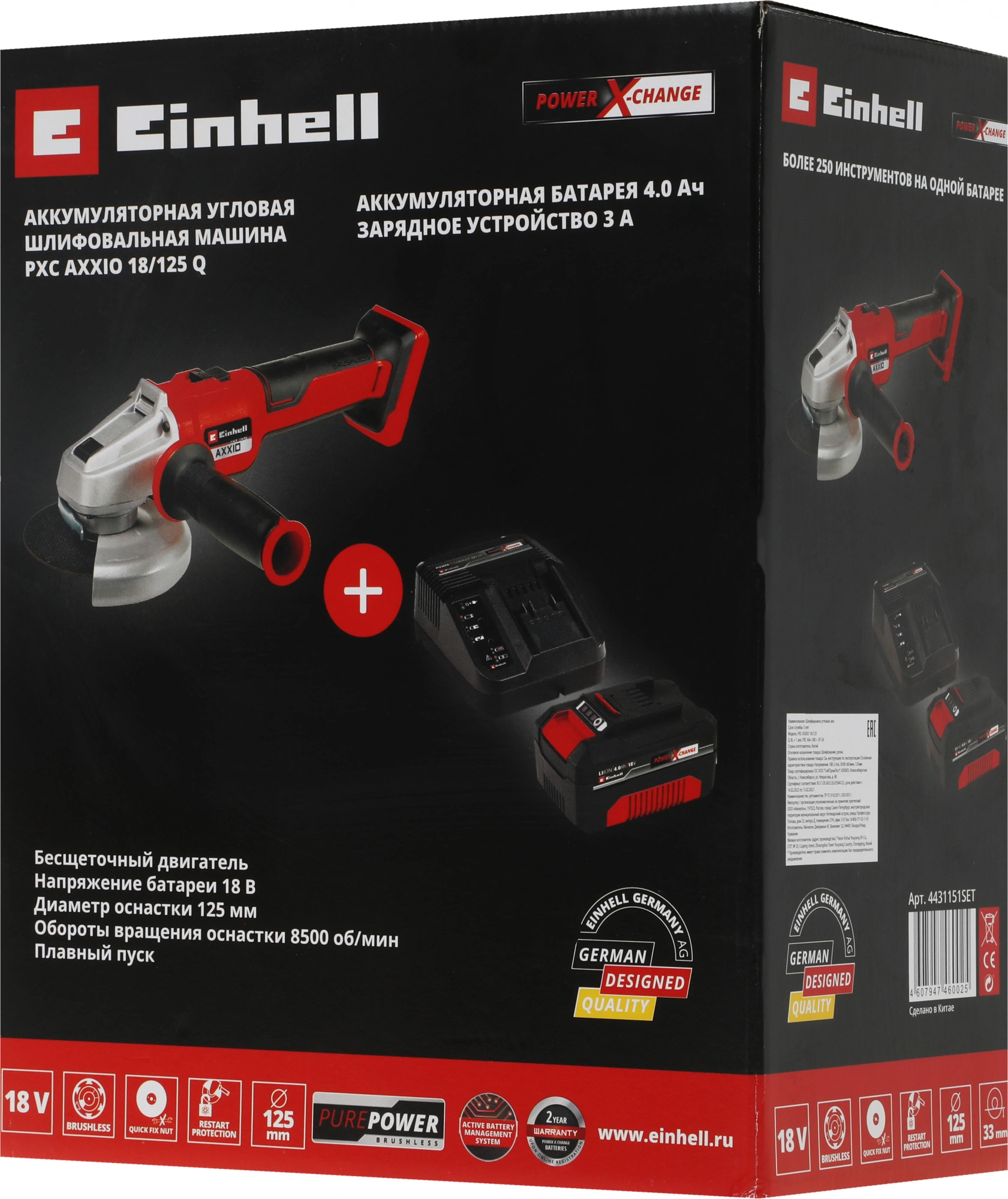 Углошлифовальная машина Einhell PXC AXXIO 8500об/мин рез.шпин.:M14 d=125мм (4431151SET)