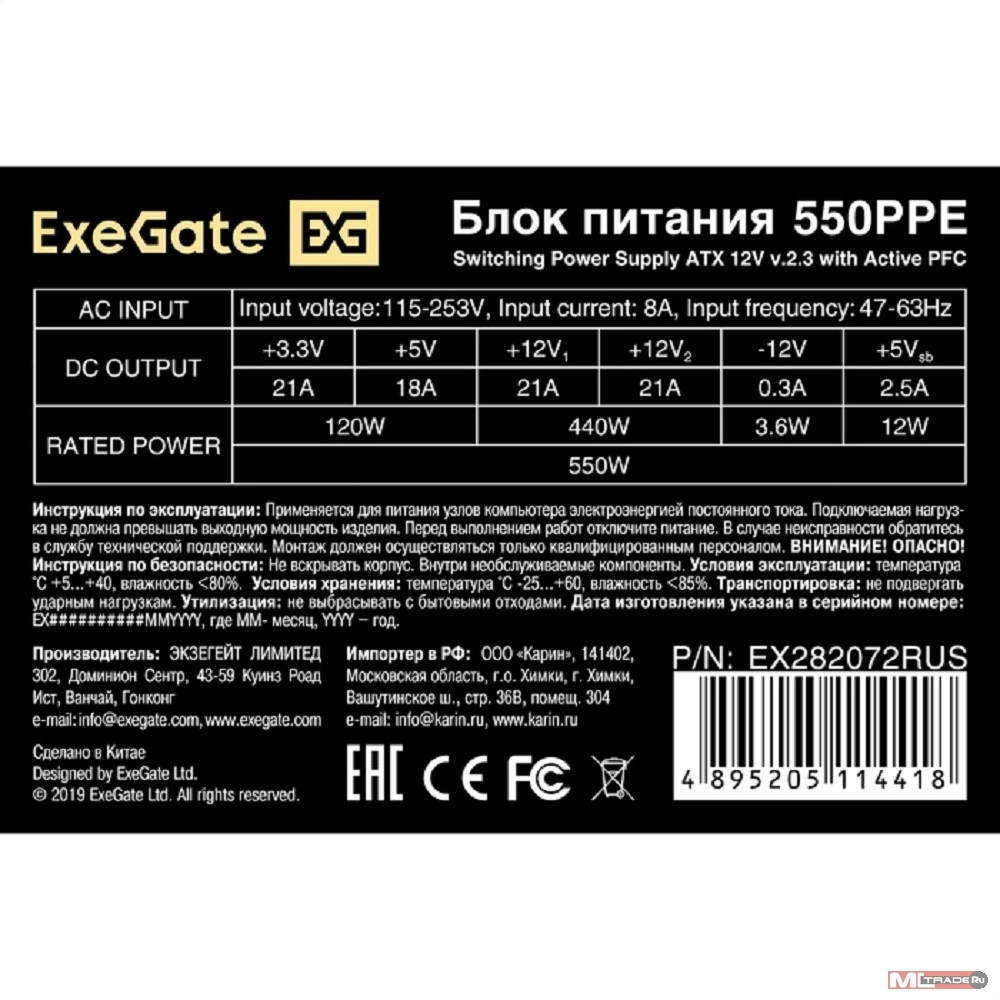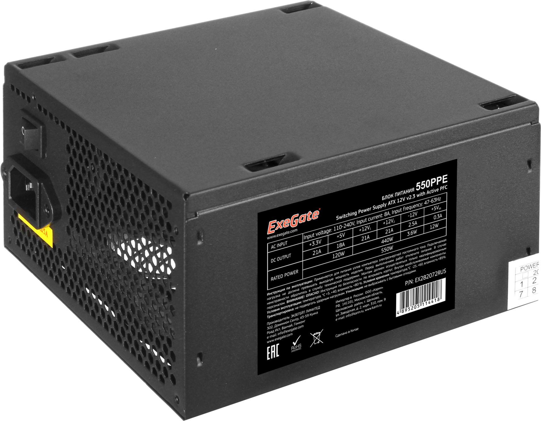 Блок питания ExeGate 550PPE+кабель 220V <EX282072RUS-PC> 550W ATX (24+2x4+6/8пин)
