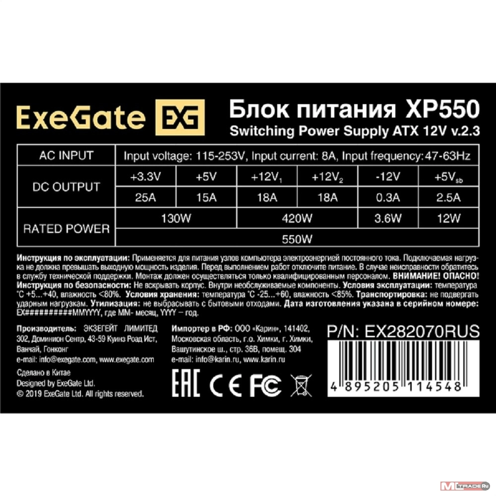 Блок питания ExeGate XP550 <EX282070RUS> 550W ATX (24+4+6/8пин)