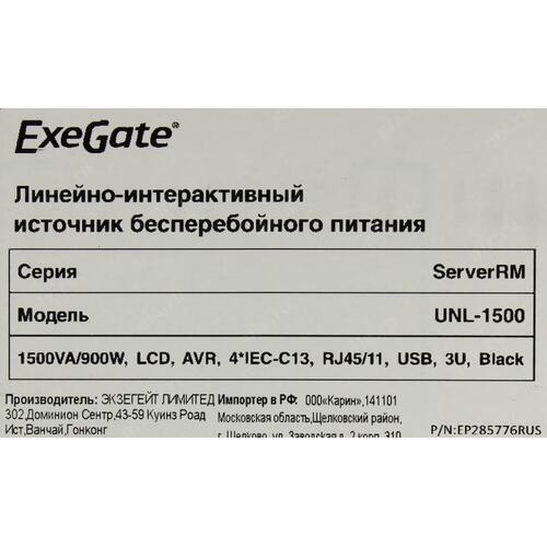 ИБП Exegate EP285776RUS ИБП ExeGate ServerRM UNL-1500.LCD.AVR.С13.RJ.USB.3U <1500VA/900W, LCD, AVR, 4*IEC-C13, RJ45/11, USB, 3U, Black>
