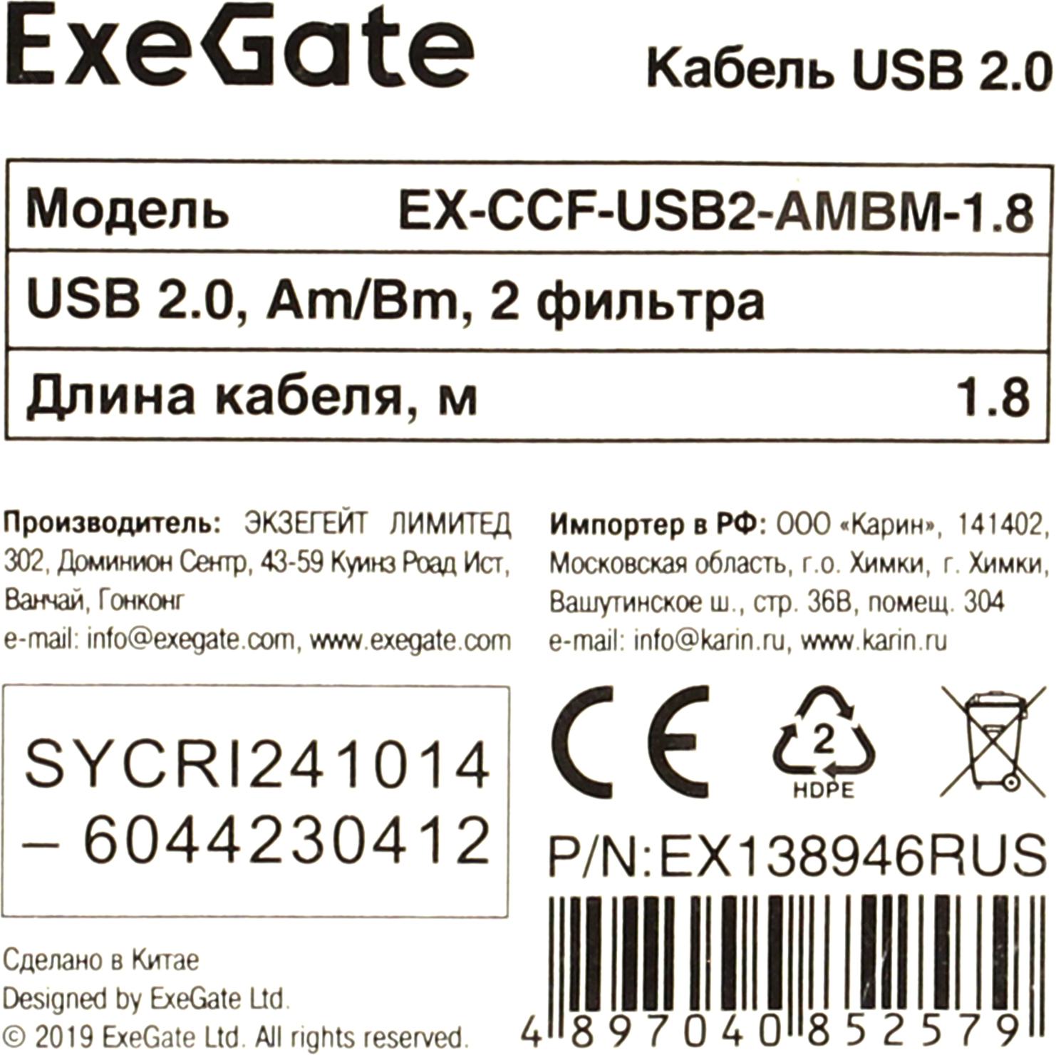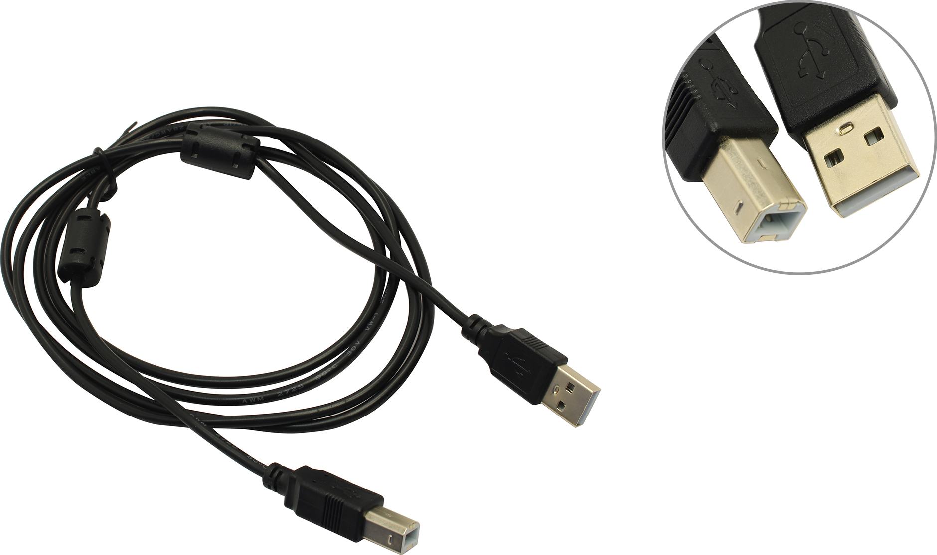 Exegate < EX138946RUS> Кабель USB 2.0 A--> B 1.8м 2 фильтра